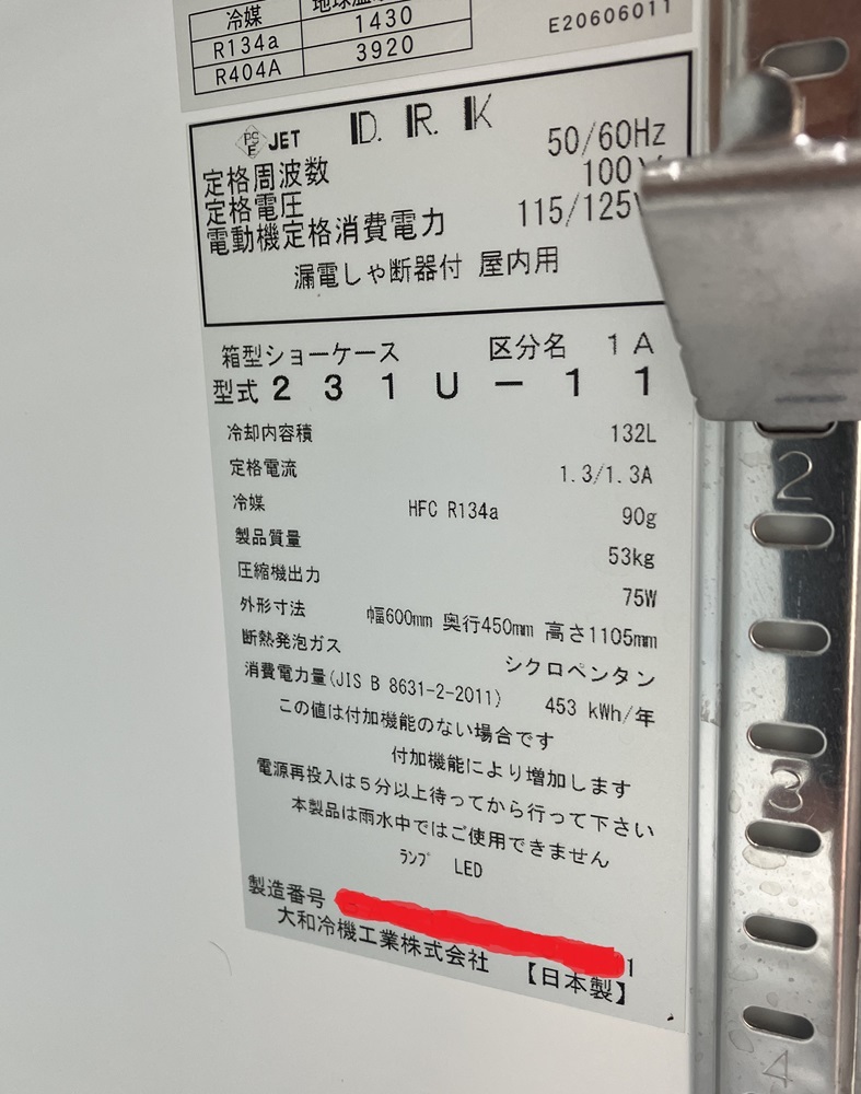 | 商品名 | 2021年製 大和冷機 スライド扉冷蔵ショーケース 231U-11 100V 幅600mm |