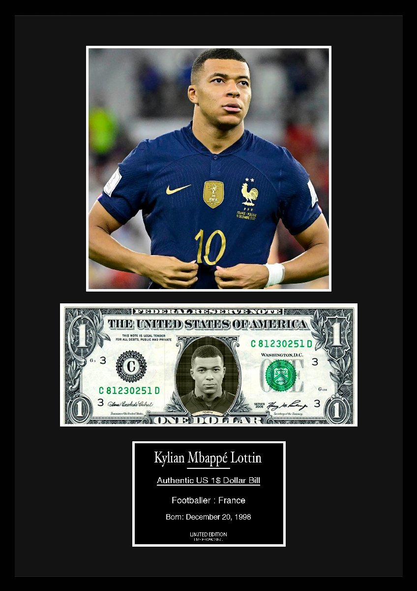 【Kylian Mbappe/キリアン・エンバペ】サッカー/ポルトガル/ワールドカップ/写真本物USA1ドル札フレーム証明書付-1