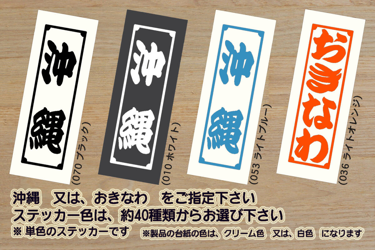 千社札 沖縄 ステッカー Sサイズ 83mm×25mm 600円 です クルマ や オートバイ 以外でも、ノートパソコン や 楽器 など 身近なアイテムのドレスアップにピッタリです ◆文言 沖縄 又は、 おきなわ をご指定下さい ◆ステッカー色 約40色からお選び下さい ※単色のステッカーです ※製品の台紙の色は、クリーム色 又は、白色 になります 指定は出来ません 4枚セットではありません、Sサイズ1枚の価格です 文字の大きさや間隔など、バランスを調整してデザインしています マーキングフィルム(ステッカーシート)は ドイツORAFOL社製 ORACAL651(中期~長期 屋外耐候年数4~5年) ※1を使用しています 多少伸び縮みするのでしわになりにくく、車のボディーなど緩やかな曲面への施行も可能です また、施工しやすいようにステッカーの上から転写透明フィルムを貼って仕上げています ステッカーを転写透明フィルムごと貼付け 転写透明フィルムのみ剥がすと パーツがばらばらにならずに施工出来ます | ||||||||||||||||||