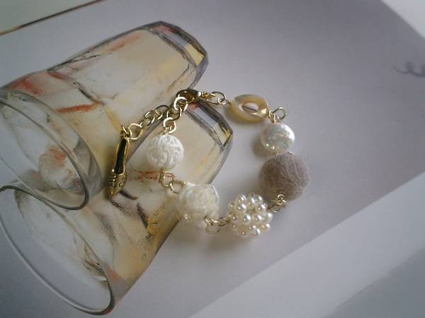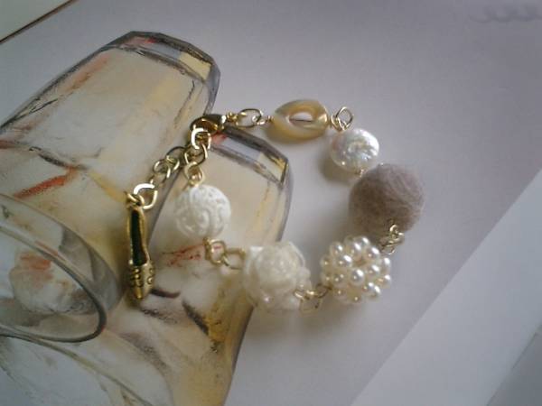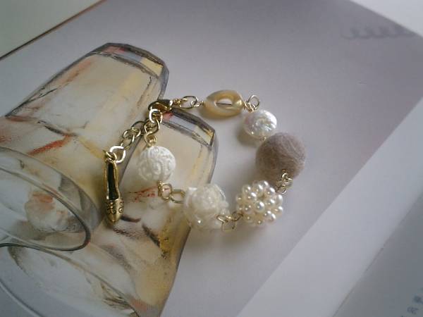 秋のクローゼットシリーズです♪キュートな異素材を集めてベージュピンクのイメージでまとめたブレスレットです♪ベージュピンクやオフホワイトなど様々なお色が混ざったフェルト玉は15ミリ位です♪14ミリの淡水パールボールや10ミリの淡水パールのコインやベージュのシェルのオーバルリングや14ミリの樹脂薔薇や透かし樹脂玉などロマンチックな素材を集めてやさしい表情です♪ベージュトーンでまとめているので色々なシーンで楽しんでいただけます♪長さは全長24センチ位で調節自由です♪お揃いのネックレスやピアスや同じシリーズも出品しています♪シンプルで飽きのこないいつまでも着けられるデザインを考えて作りました!ハンドメイドをご理解頂いてノークレーム、ノーリターンでお願いします