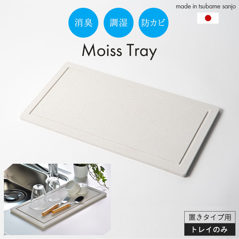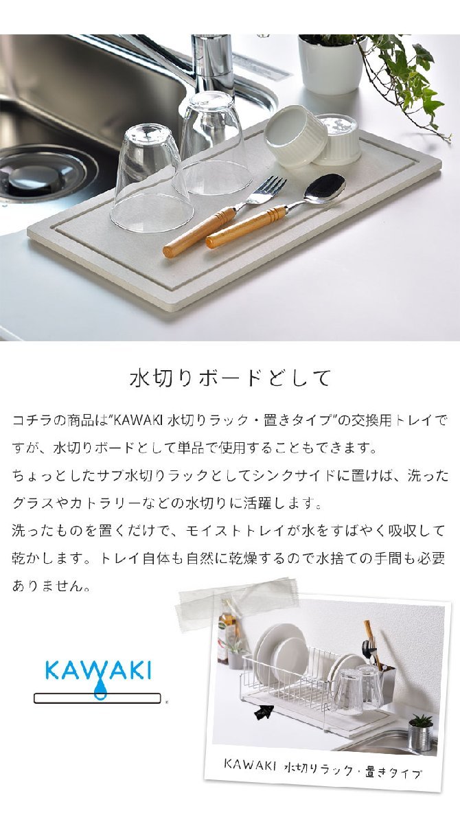 | KAWAKIシリーズの水切りラック置きタイプ専用の交換モイストレイですが、トレイ単品だけでも使用できます。 シンク横などに置いて洗った物をのせるだけで乾かせます。 洗い物から落ちた水滴を吸収し、徐々に空気中に放出してくれる日本製の吸収トレイ。 水捨ての手間や、水垢の心配もなくお手入れ簡単です。 吸水力が弱ったと感じたら、風通しの良い場所で陰干しをしてください、汚れがついた場合は付属の紙ヤスリでこすってください。 置いた場所を傷つけないように貼付け式のクッションが付いてます。 【モイスとは】 吸水素材モイスは、天然素材を主成分とするインテリア建材です。 バーミキュライトや珪砂を主成分とした、天然鉱物から作られる日本製の建材です。 珪藻土同様、水分を吸収し吐き出す性質から、近年バスマットや水切りプレートとしても人気の素材です。 吸水が早く、表面の手触りがサラっとしているのも特徴です。 |