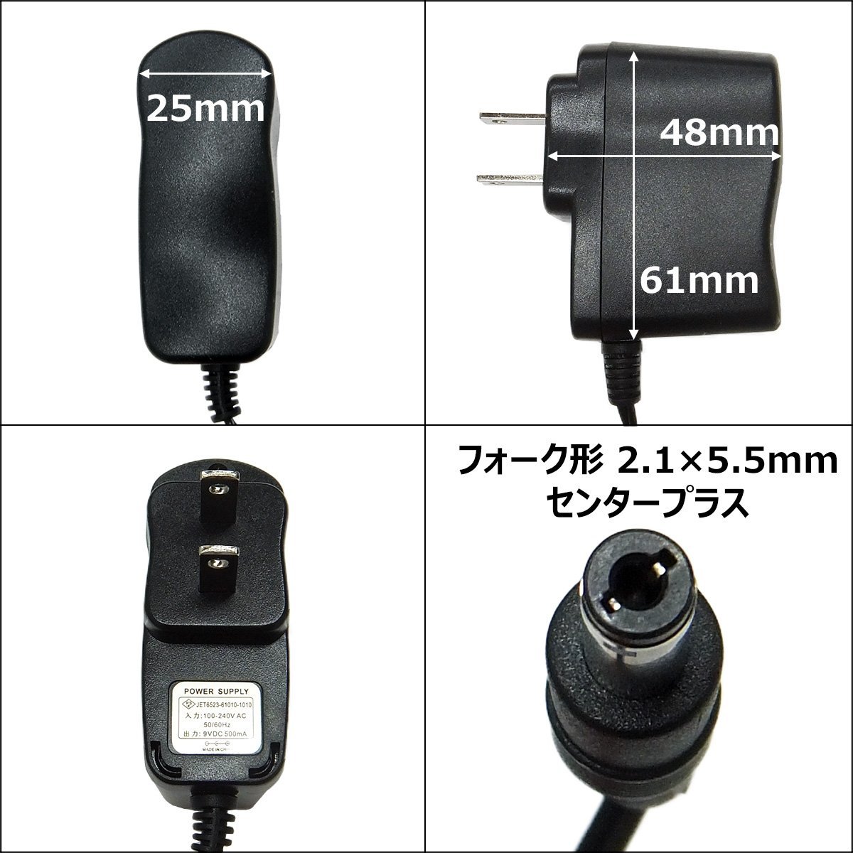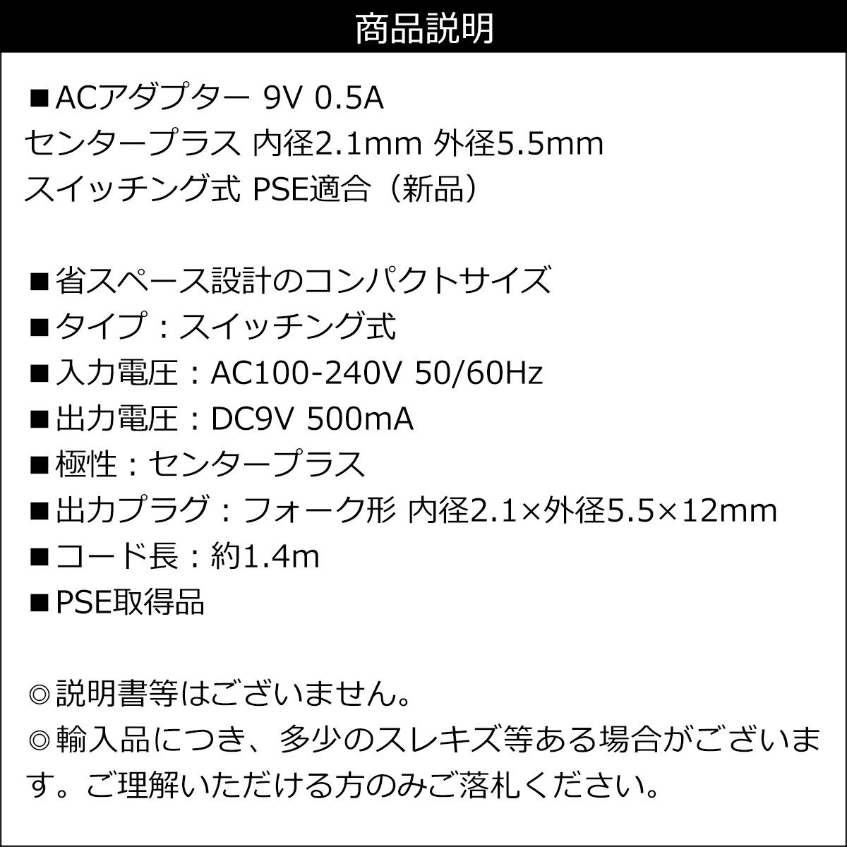 ■ACアダプター 9V 0.5A センタープラス 内径2.1mm 外径5.5mm スイッチング式 PSE適合(新品)