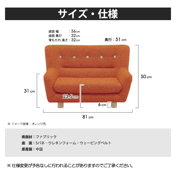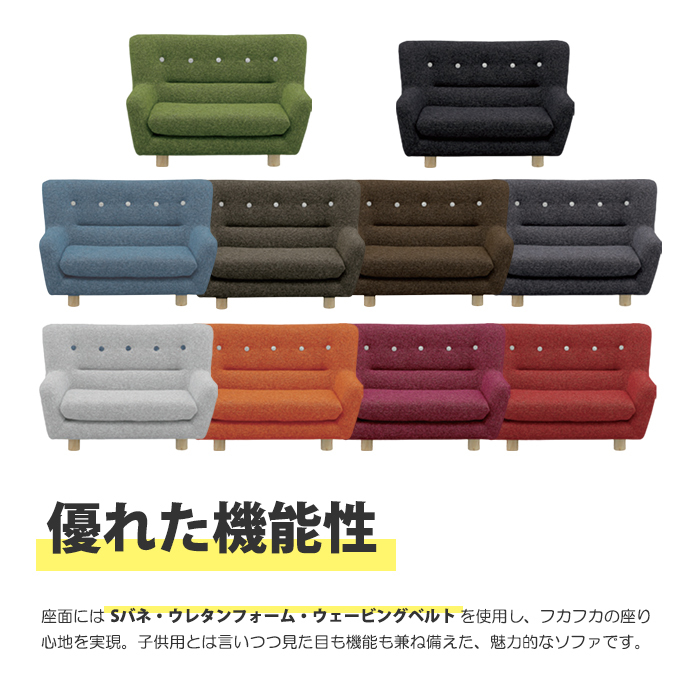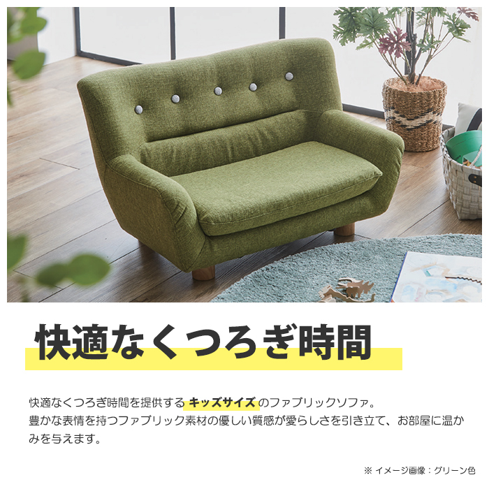 特  徴快適なくつろぎ時間を提供するキッズサイズのファブリックソファ。