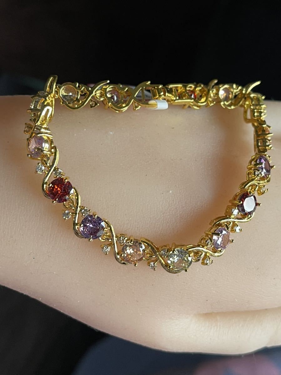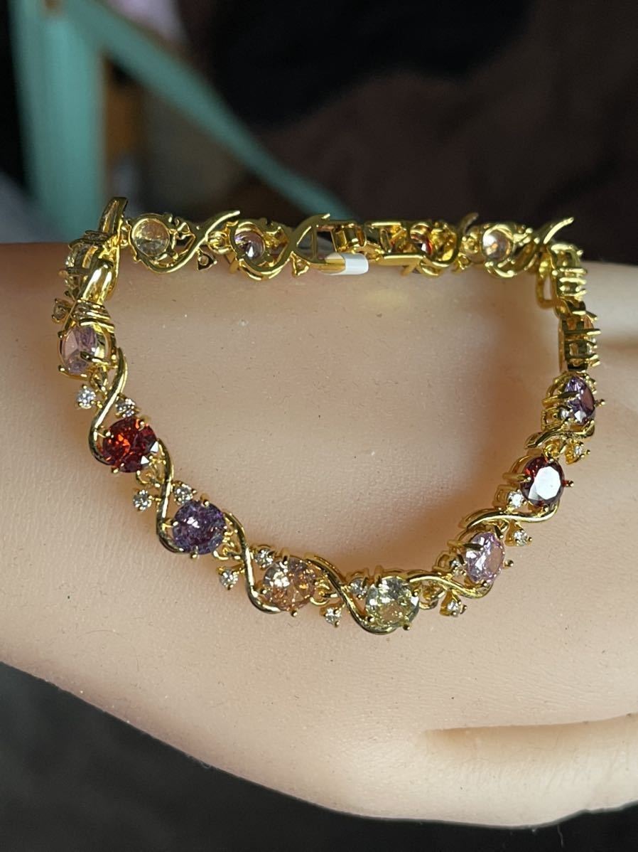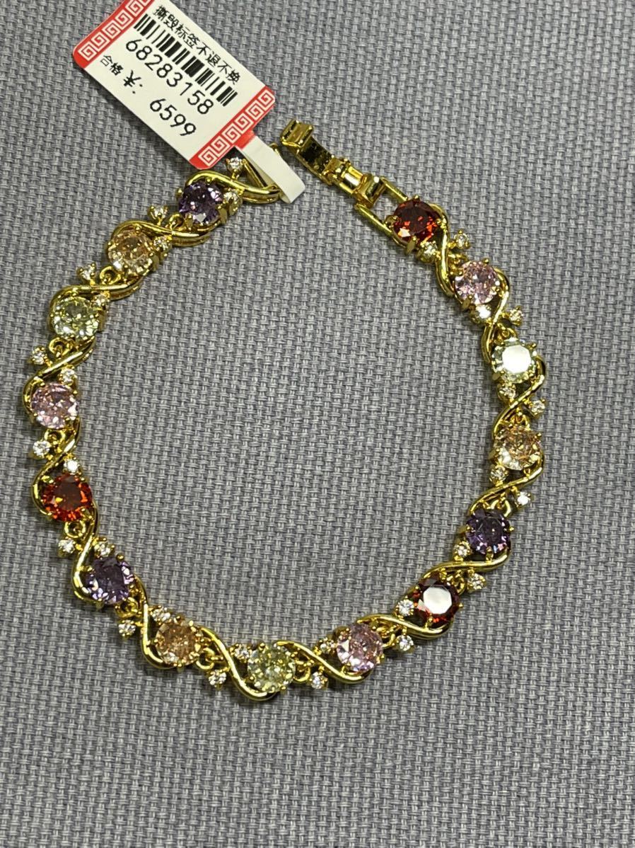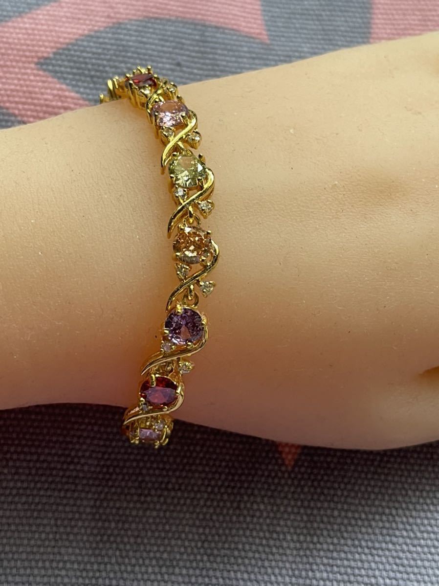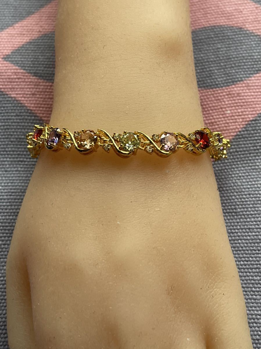 ブレスレットの長さは20センチ。宝石サイズ:6 mm。宝石は全部で15個ある。金属部分は金メッキ