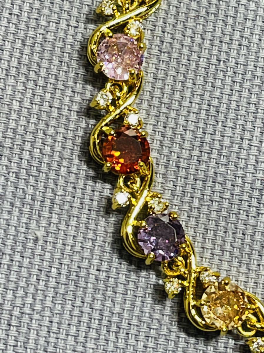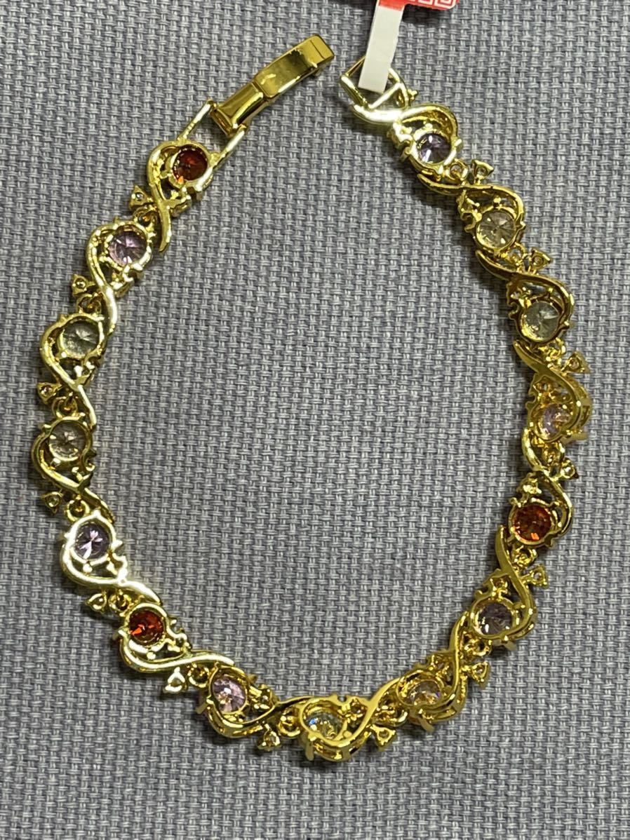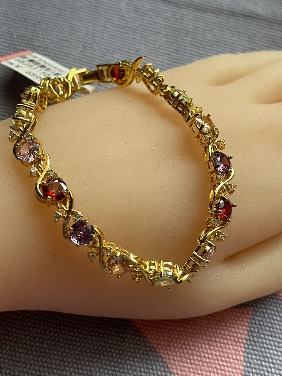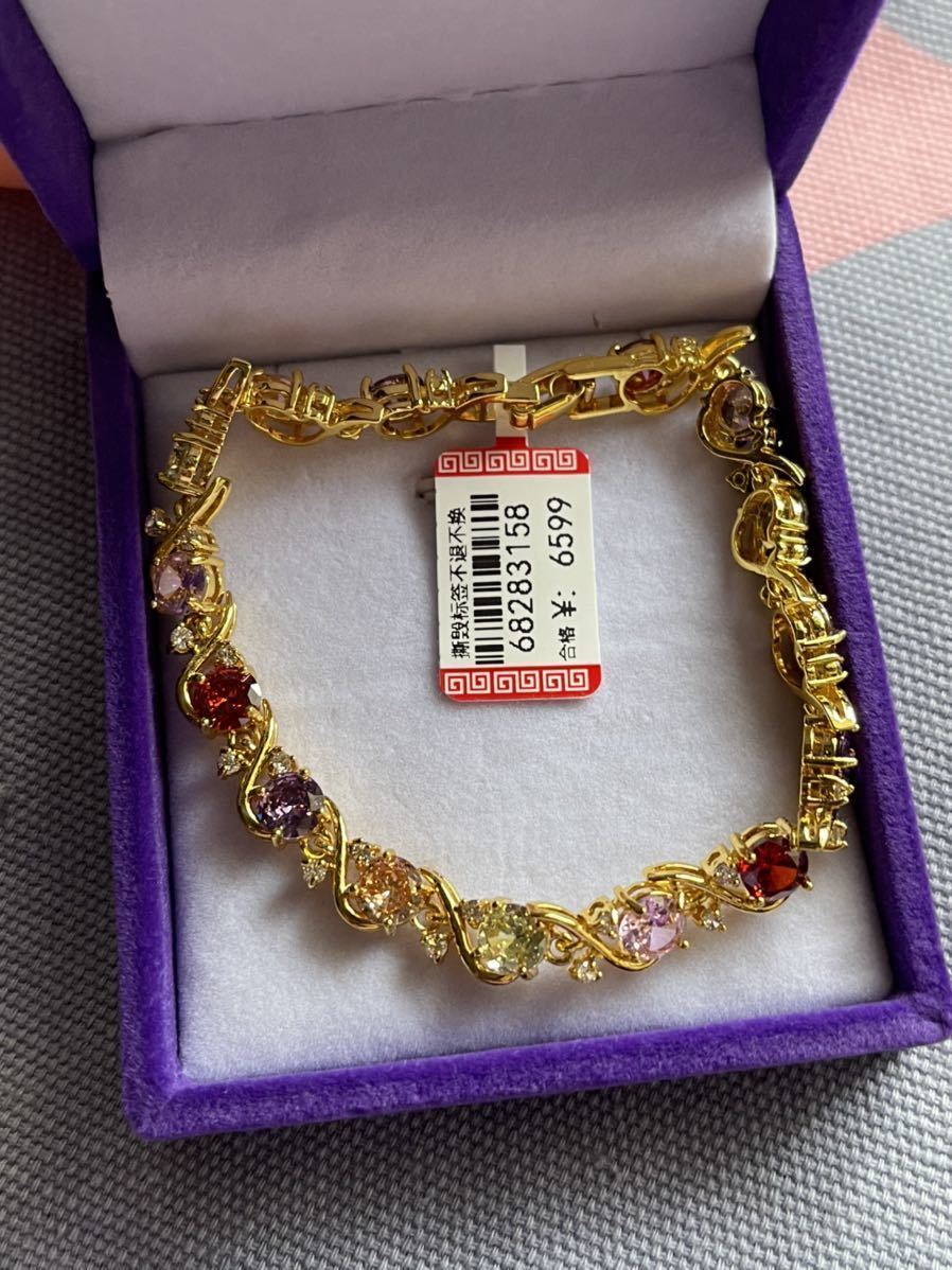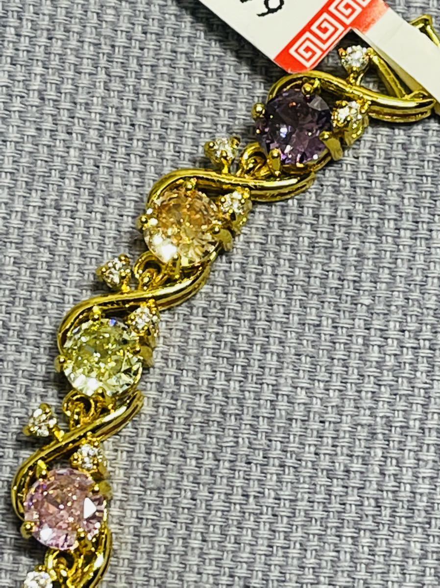 ブレスレットの長さは20センチ。宝石サイズ:6 mm。宝石は全部で15個ある。金属部分は金メッキ