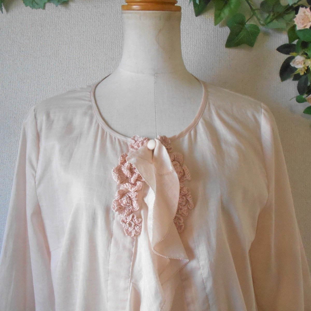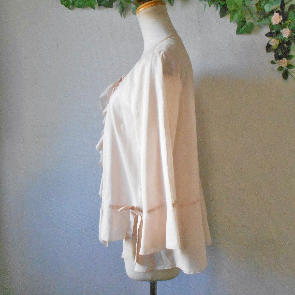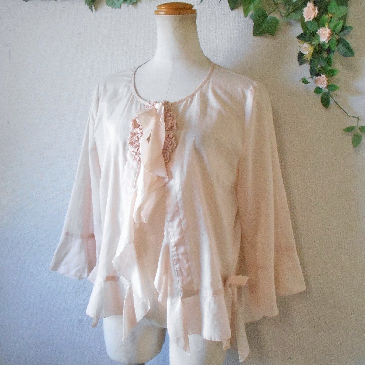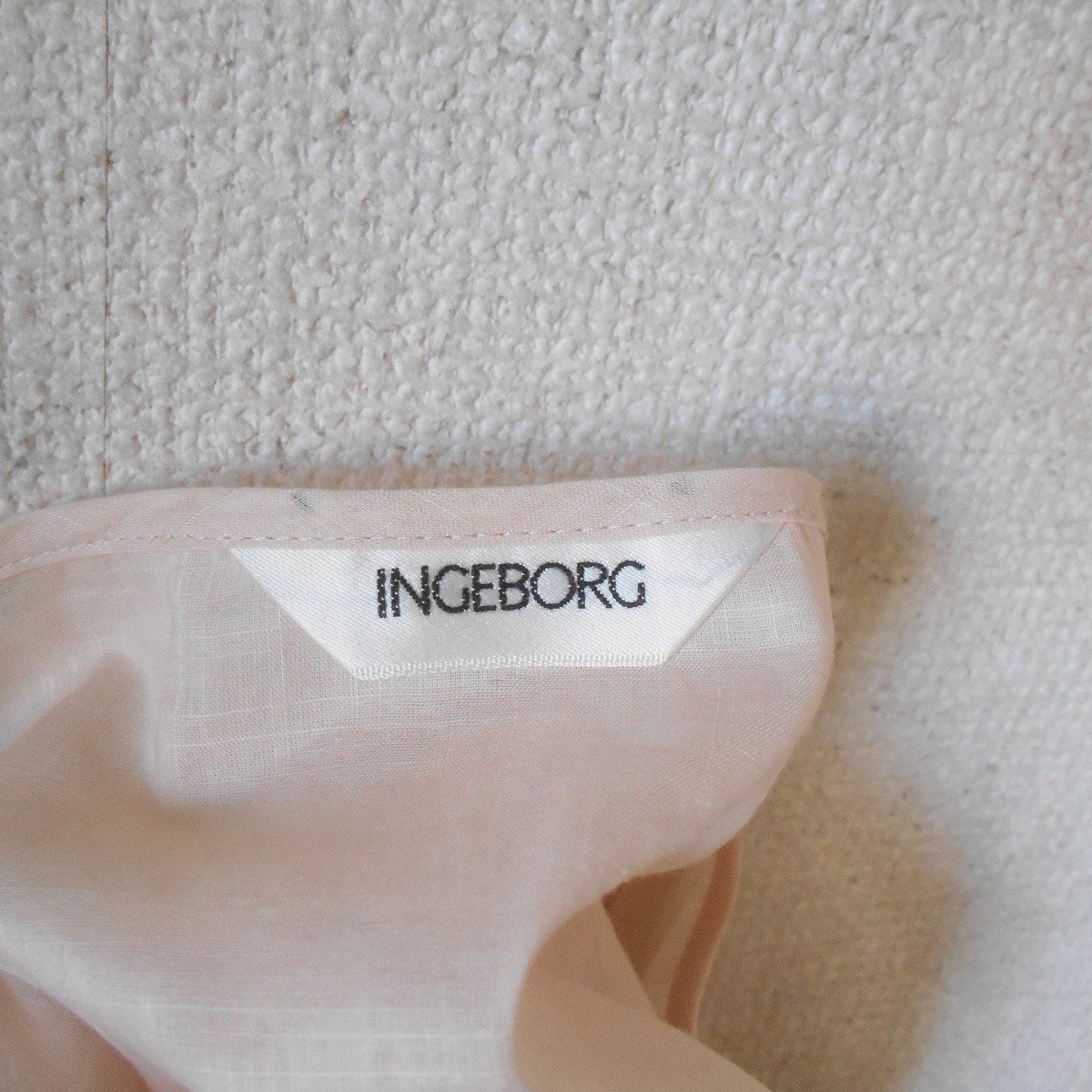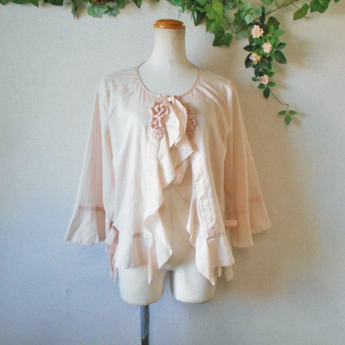 【ポイント】インゲボルグのジャケット(ブラウス?)になります。お色はピンク系で7分袖の夏を中心に着ていただけるお品です。前はトップのボタン1つで首元にはお花のモチーフが付いた、とっても素敵なデザインです。