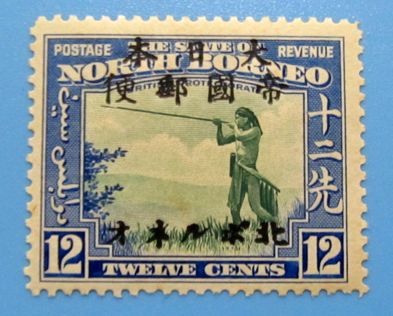 南方占領地切手 旧北ボルネオ 原住民の吹き矢 大日本帝国郵便 黒加刷 12セント 変色 丸まり 未使用