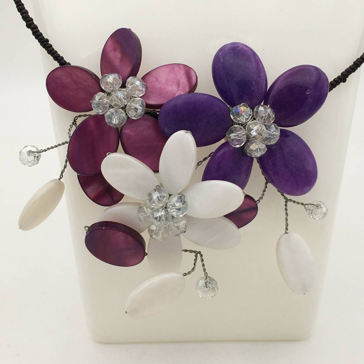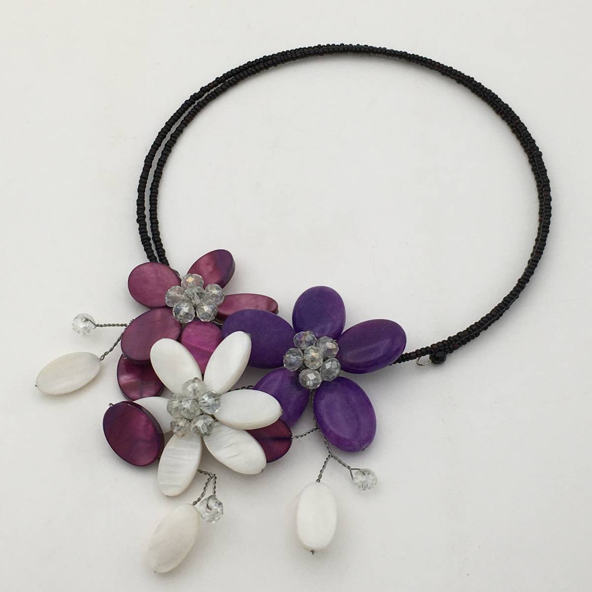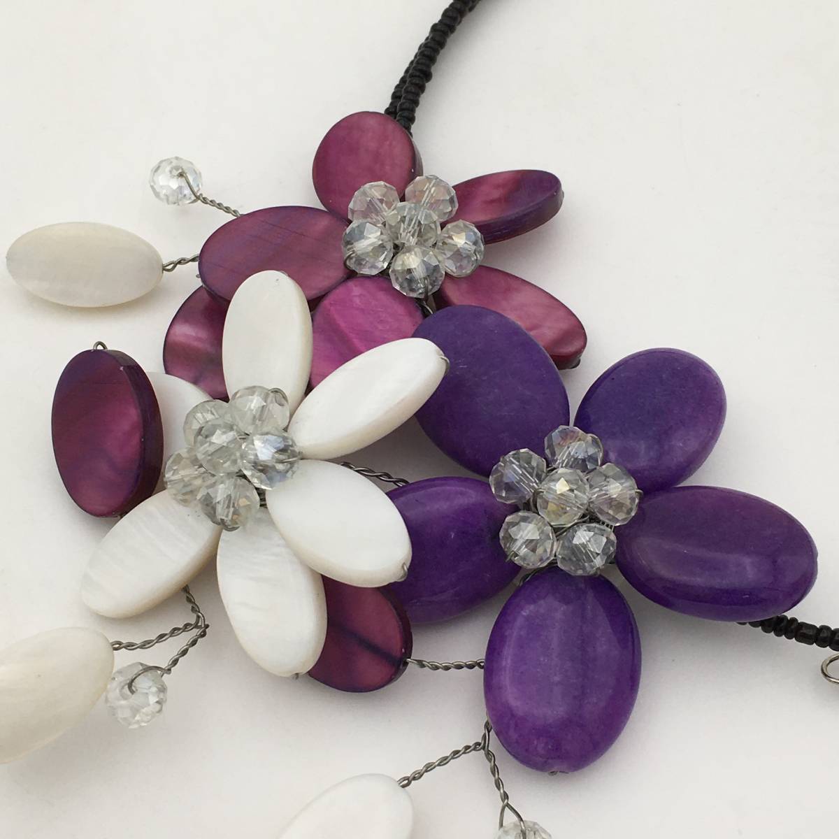 <新品>パープル シェル フラワー 花 ブラック ビーズ レディース ネックレス 約34~46cm 調節可能 結婚式 プレゼント パーティー