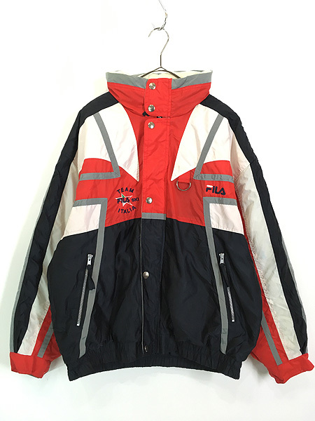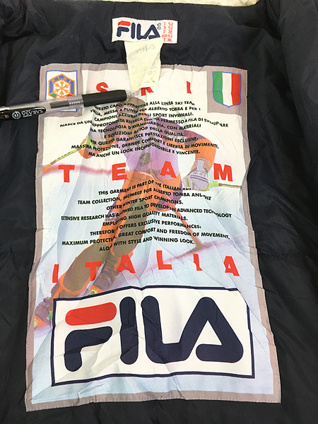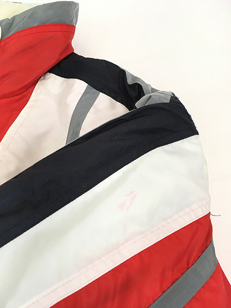 ハリのあるナイロンシェル、裏地は中綿の詰まったナイロンキルティング、フードは首後ろに収納可能。