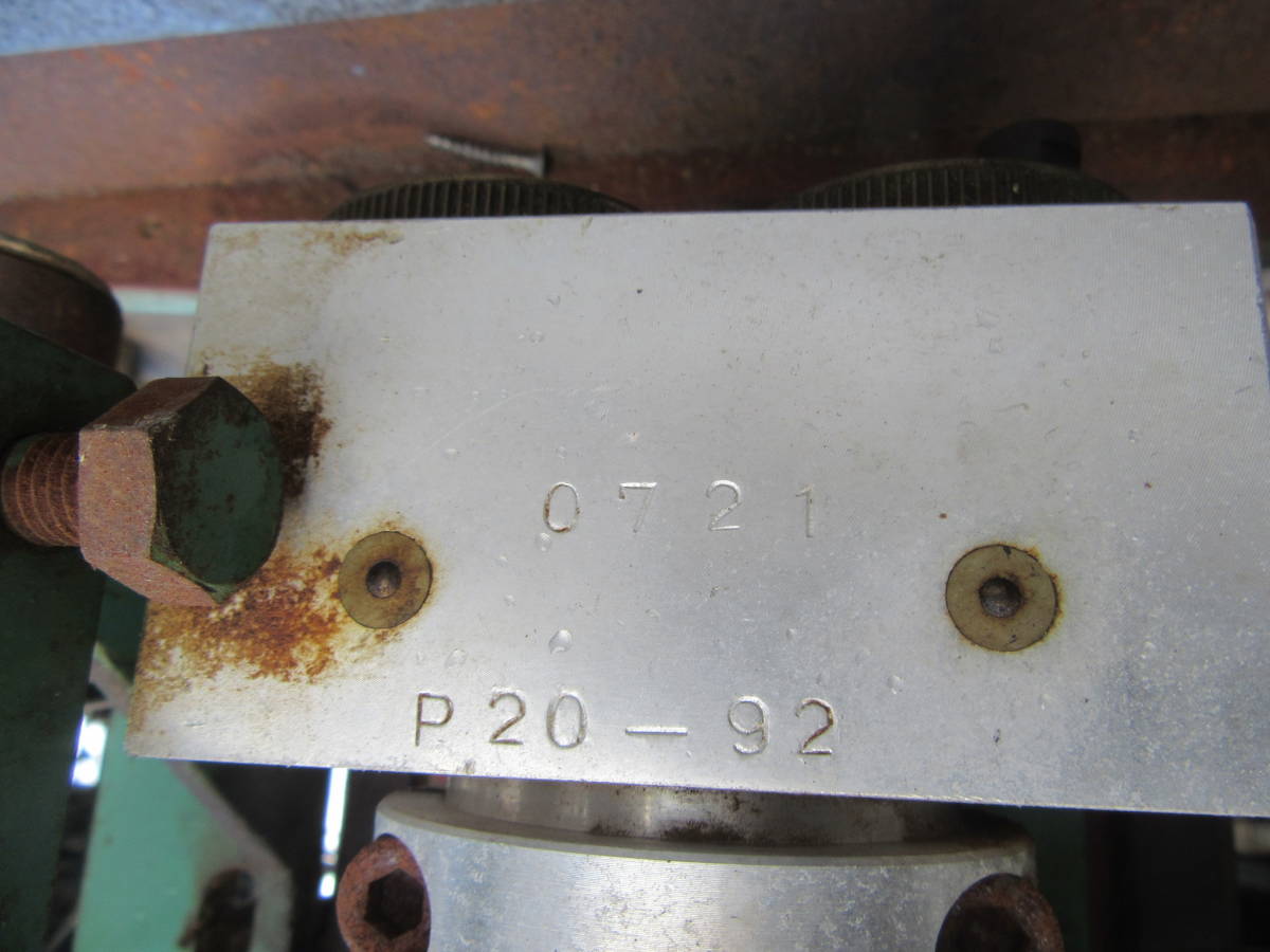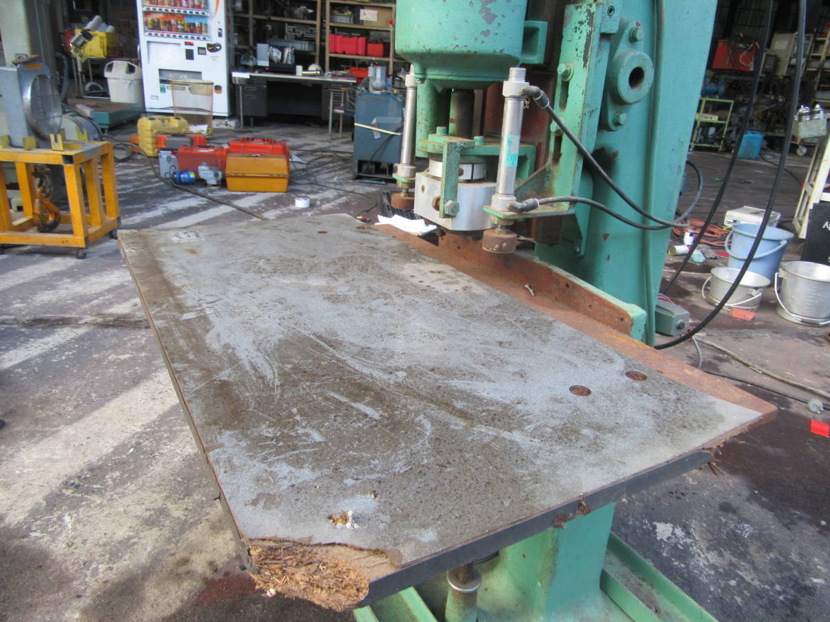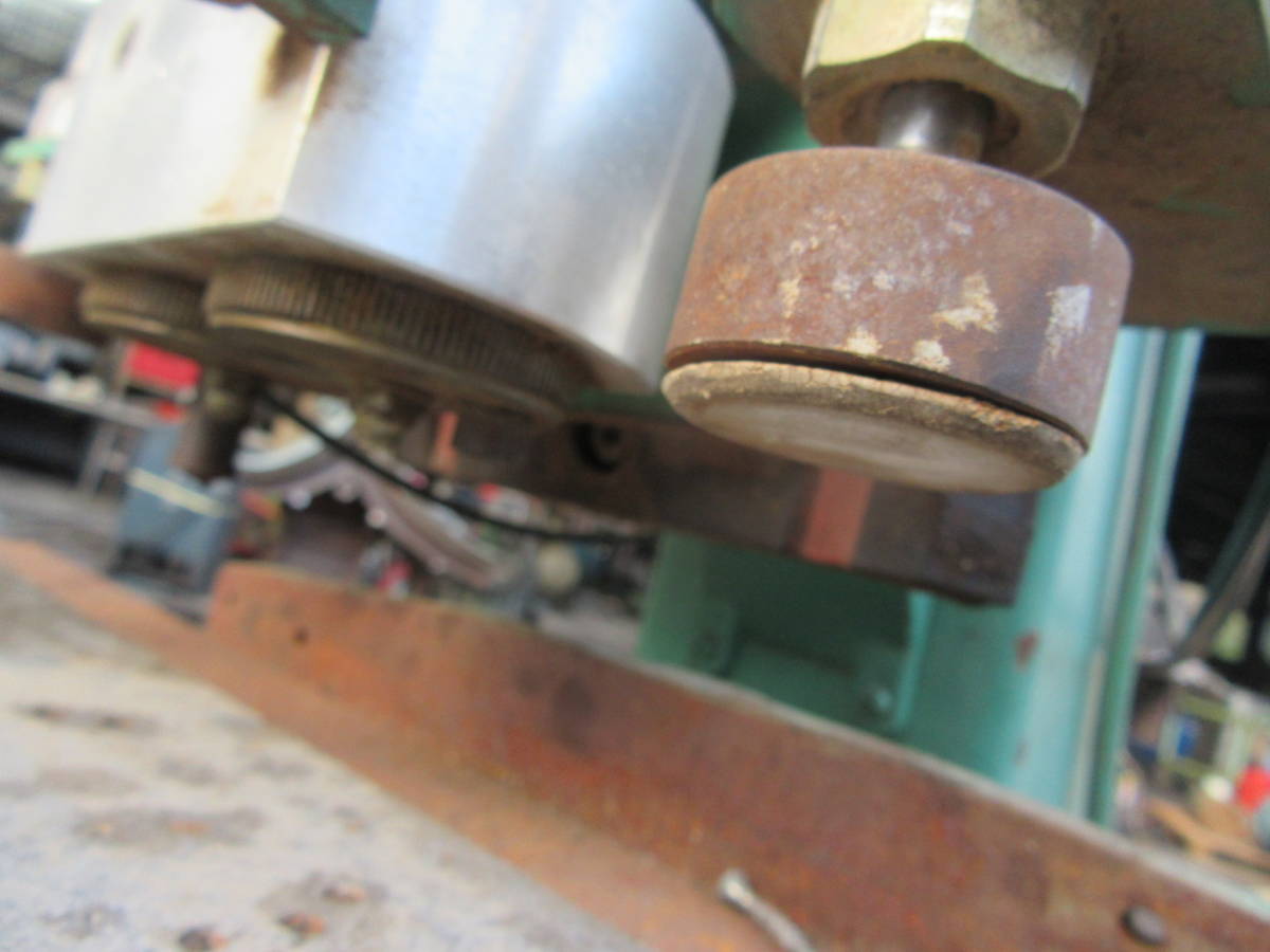 まず、エアーのソレノイドバルブのプラスチックの口金が割れてるが、型式があるので注文はできるとおもいます。 タイヨウのSR551-RE22R型です。 エアー配線も切れてたので直接エアーを入れててテストしました。エアーシリンダーの動きは万力・メインシリンダーともに良好。 ソレノイドバルブとエアー配管の手直しでいけそうだ。  万力のストロークは100㎜。 天板の高さ調整ストロークは150㎜。