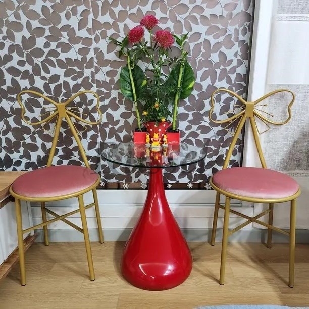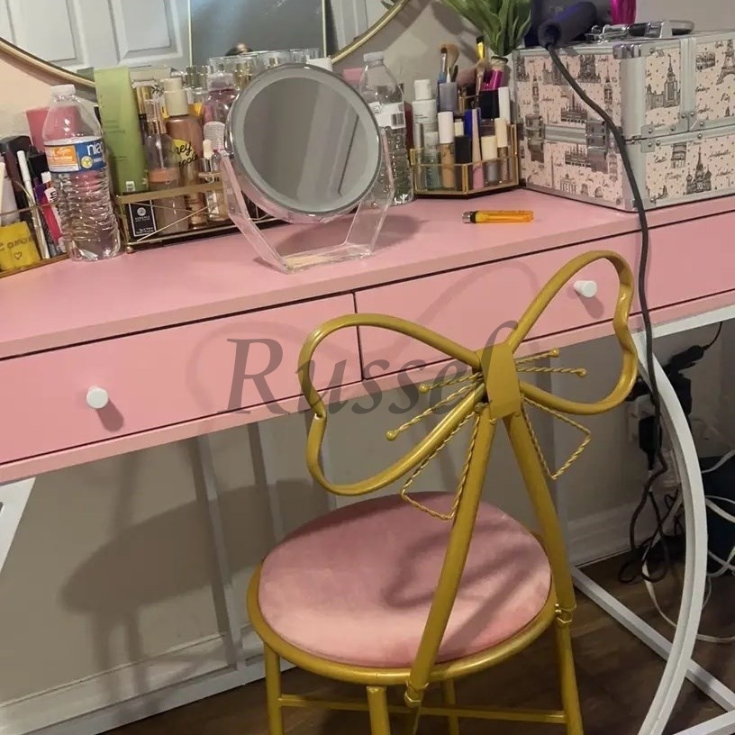 ラグジュアリーな空間を演出する、可愛いリボンが特徴のピンクの化粧椅子です。ゴールデンメタルの脚と背もたれ付きのデザインが華やかさをプラスし、女の子や女性にぴったりのアンティークな雰囲気を醸し出します。