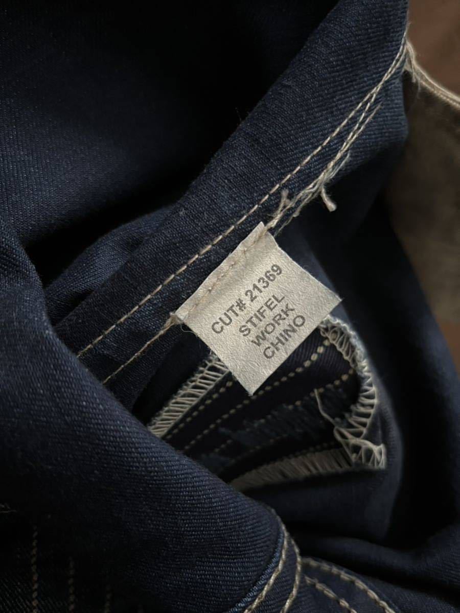 細部もオリジナルを踏襲したフラップ付きの片玉縁仕様のバックポケット、ウエストバンドにはサスぺンダーボタン、トップボタンには刻印入りのドーナツボタンが付属、フロントのウォッチポケット、股下の三角形の切り返し(動きやすさを考慮した当時物のワークトラウザーによくみられるディテールです)等、全盛期ならではの圧巻の作り込みの数々。
