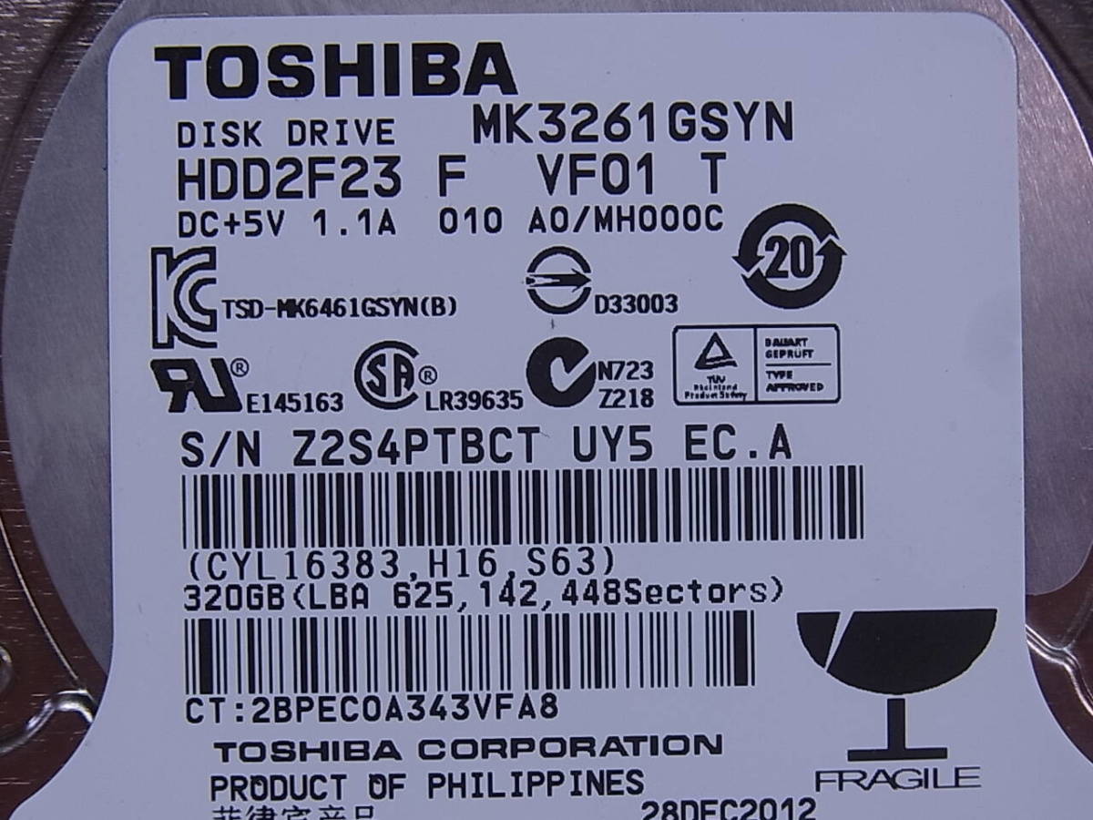 △F/929●東芝 TOSHIBA☆2.5インチHDD(ハードディスク)☆320GB SATA300 7200rpm☆MK3261GSYN☆中古品 | |