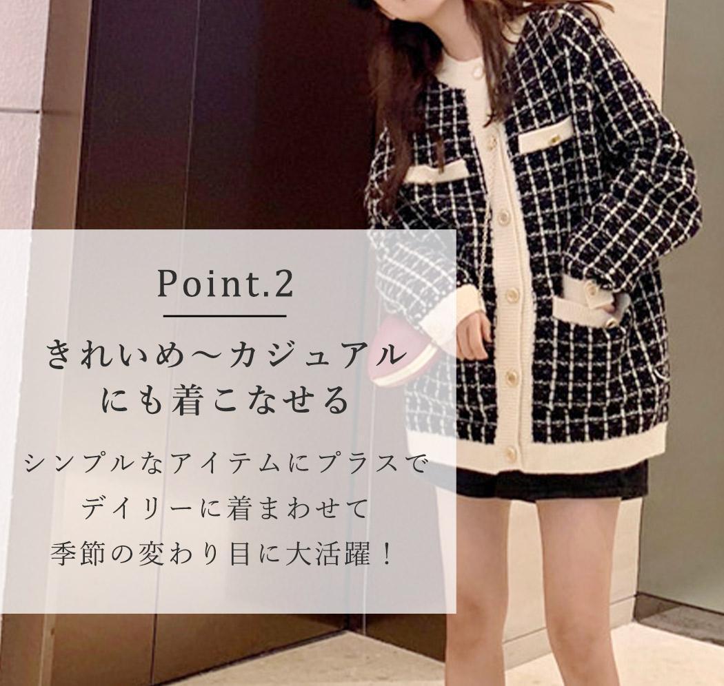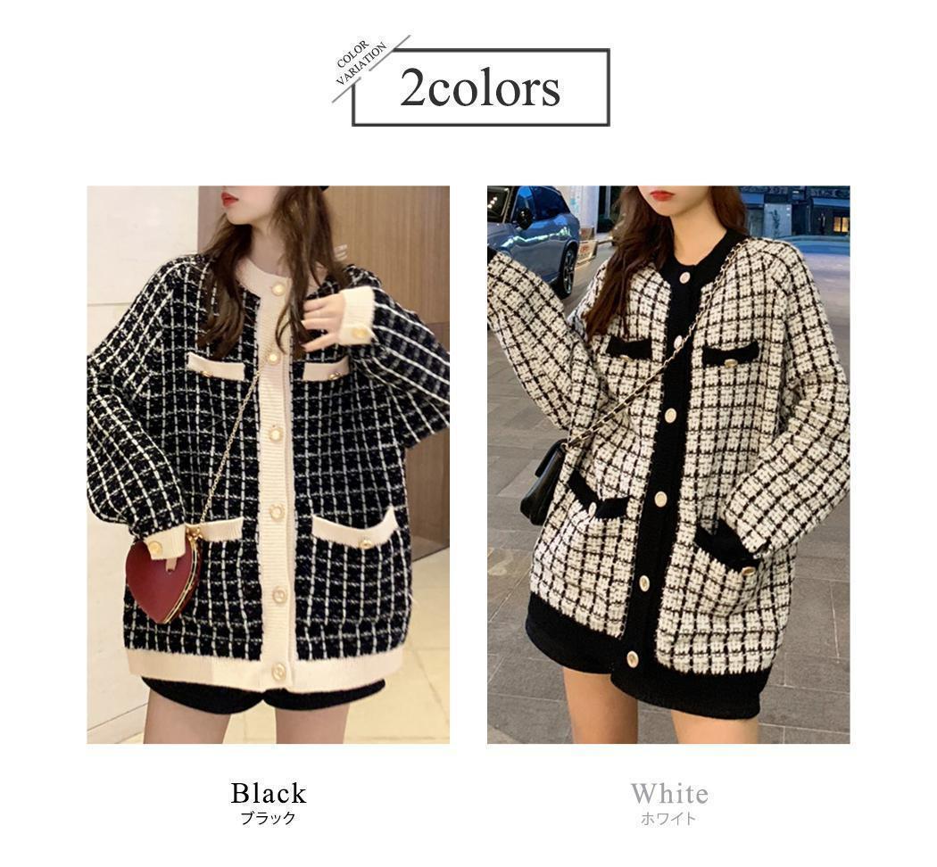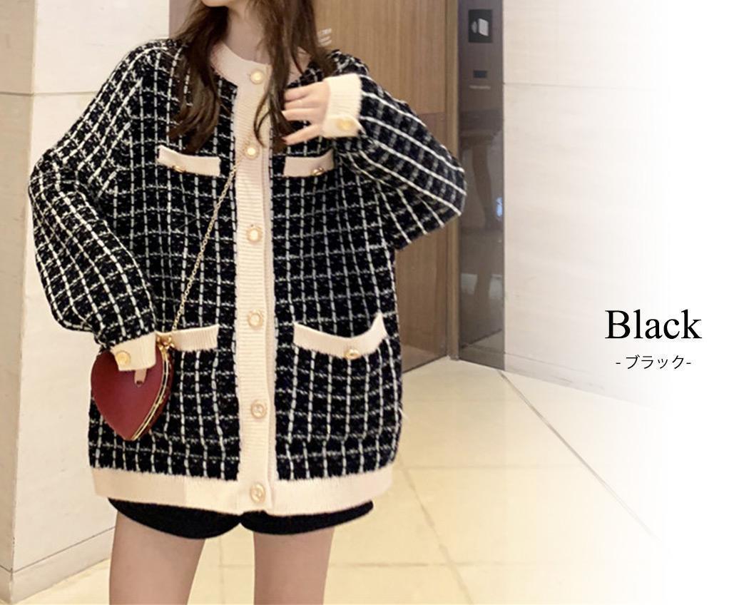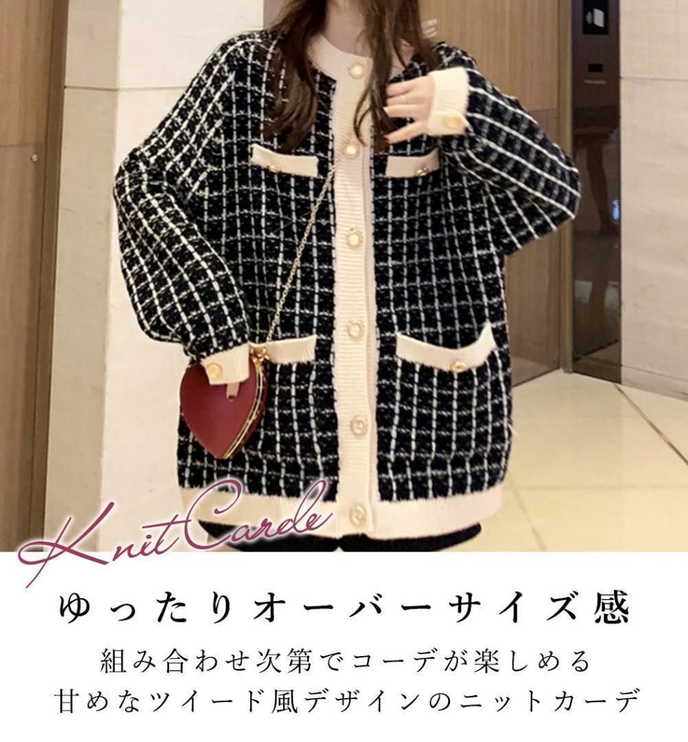 ツイードニットカーディガン ボレロ 長袖 カーディガン 体型カバー オーバーサイズ ビッグシルエット チェック柄 厚手 ニット生地 お洒落 可愛い シンプル モード エレガント ガーリー フォーマル フェミニン ナチュラル カジュアル こなれ感 ママ 秋 冬 黒 白