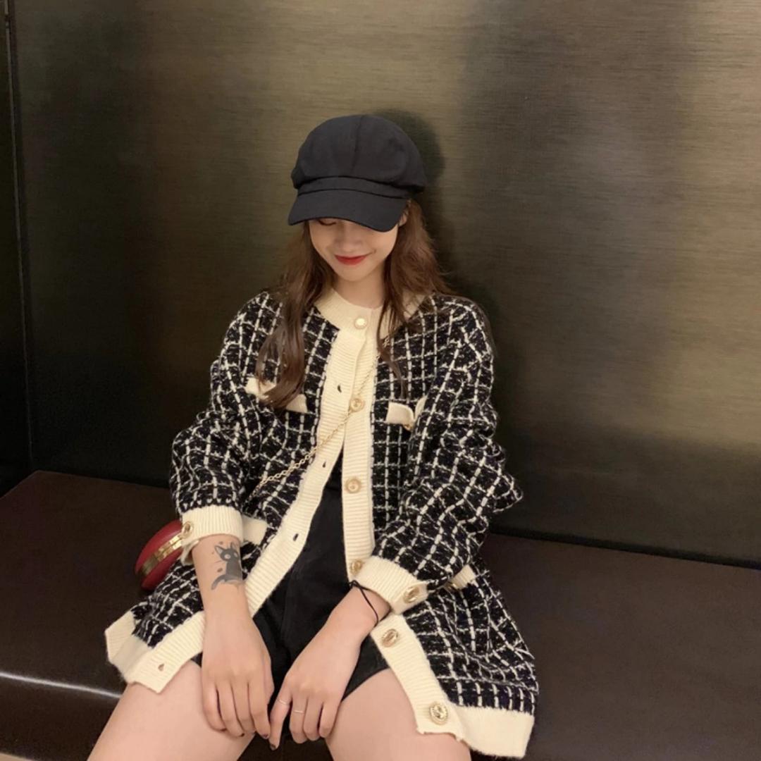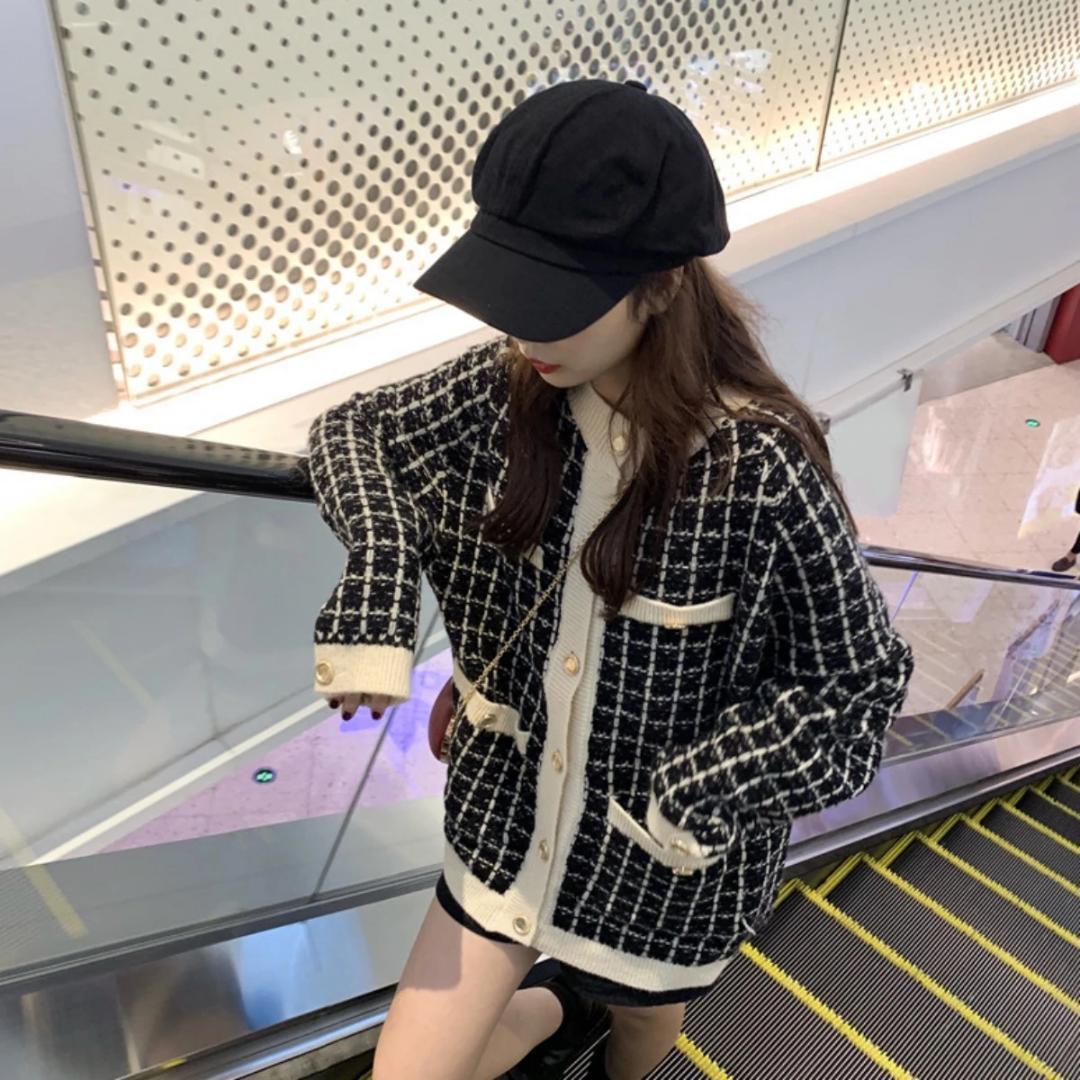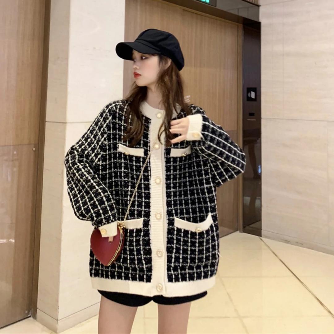 ツイードニットカーディガン ボレロ 長袖 カーディガン 体型カバー オーバーサイズ ビッグシルエット チェック柄 厚手 ニット生地 お洒落 可愛い シンプル モード エレガント ガーリー フォーマル フェミニン ナチュラル カジュアル こなれ感 ママ 秋 冬 黒 白