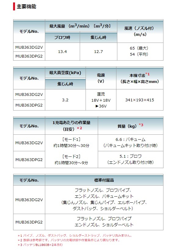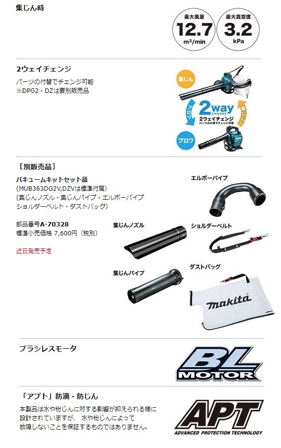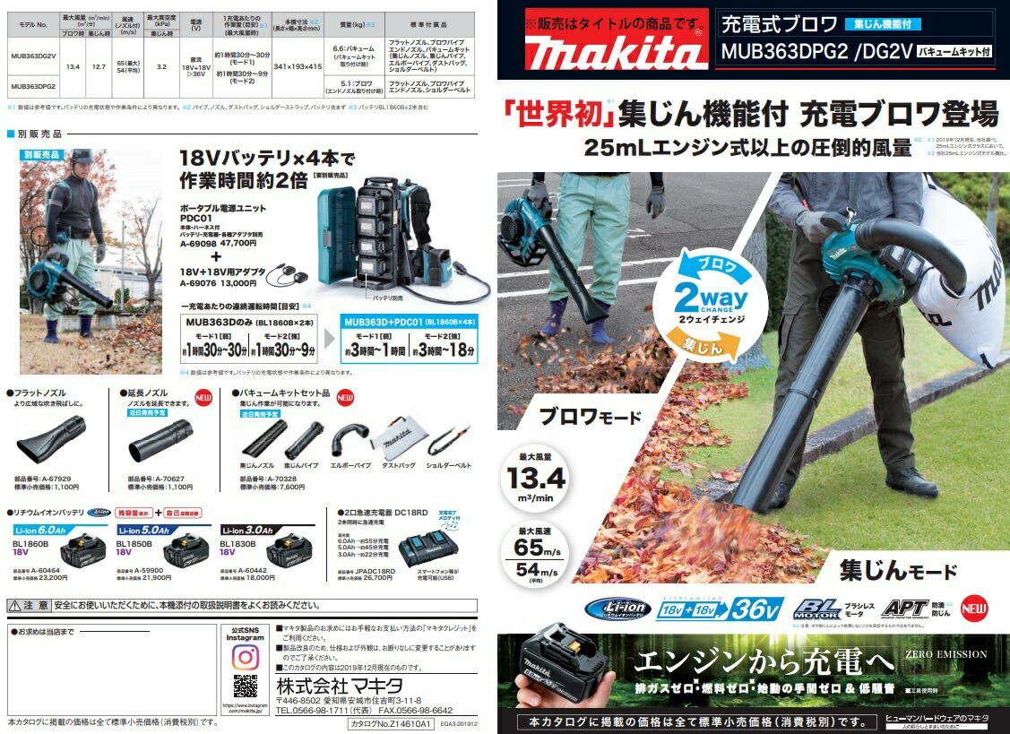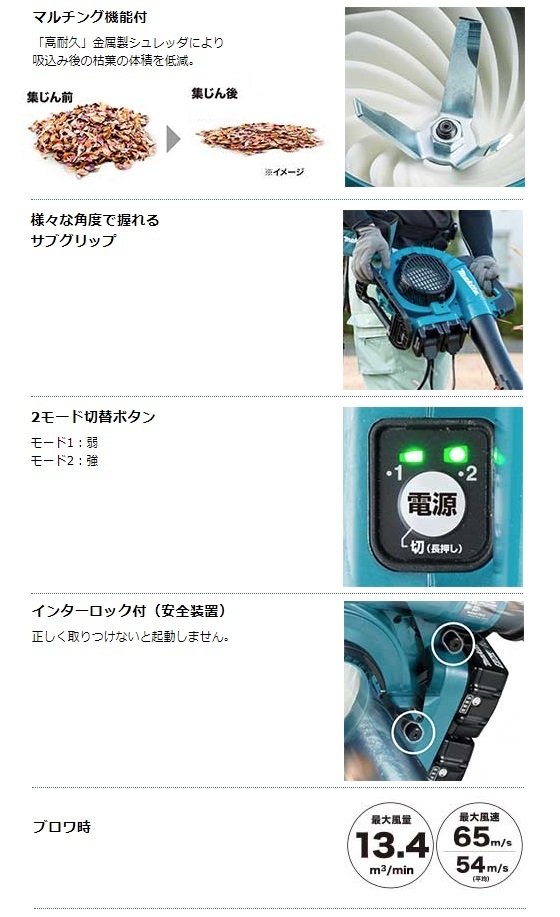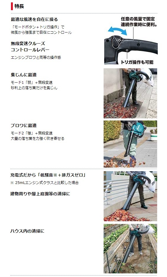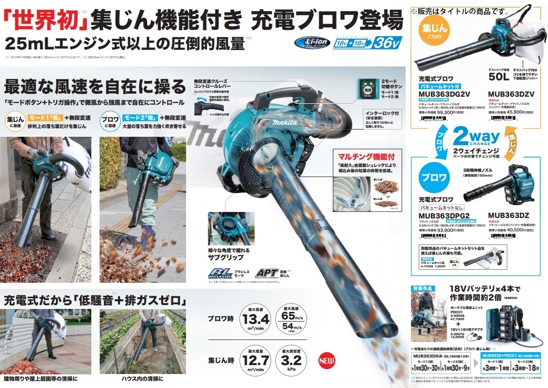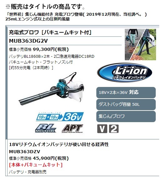 マキタ makita充電式ブロワ(バキュームキット付)MUB363DZV本体・バキュームキット付※バッテリ・充電器は別販売品です。88381895279「世界初」集じん機能付き 充電ブロワ登場( 2019年12月現在、マキタ社調べ。 )25mLエンジン式以上の圧倒的風量■最適な風速を自在に操る「モードボタン+トリガ操作」で微風から強風まで自在にコントロール■無段変速クルーズ コントロールレバーエンジンブロワと同等の操作感■充電式だから「低騒音※+排ガスゼロ」※ 25mLエンジン式クラスと比較した場合■マルチング機能付「高耐久」金属製シュレッダにより吸込み後の枯葉の体積を低減。■様々な角度で握れるサブグリップ■2モード切替ボタン■インターロック付(安全装置)正しく取りつけないと起動しません。■ブラシレスモータ■「アプト」防滴・防じん本製品は水や粉じんに対する影響が抑えられる様に設計されていますが、 水や粉じんによって故障しないことを保証するものではありません。