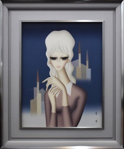 この作品《郷愁》は、東郷青児の美人画の中でも特に感情を内包した詩的な一枚です。 ・完全な写実でもなく、抽象でもない ・美しくも、少し哀しい ・現実と幻想のあわいを漂うような雰囲気 それこそが、東郷の魅力であり、《郷愁》というタイトルと見事に呼応しています。