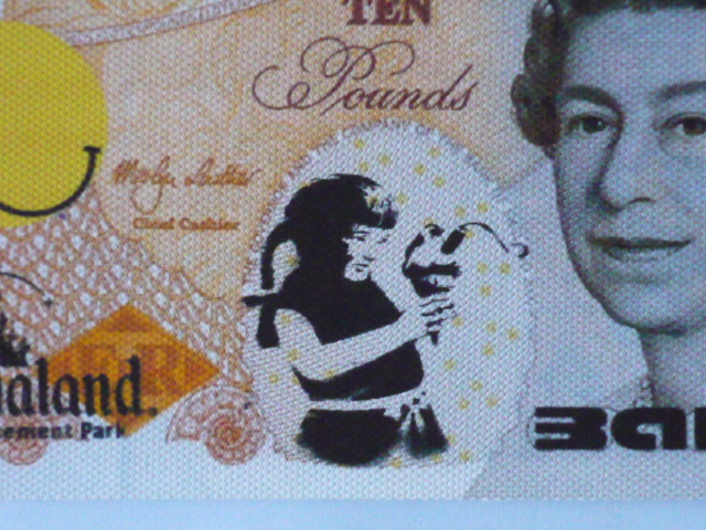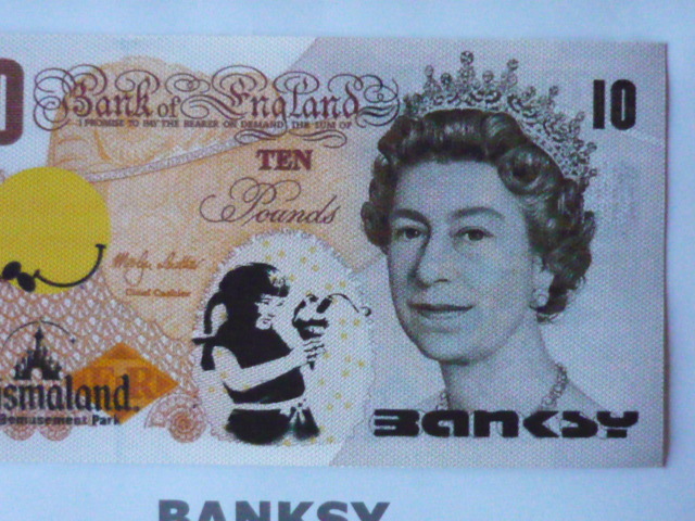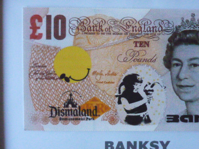 バンクシー Banksy (Banksy Dismaland ) 作品タイトル → ディズマル紙幣 10ポンド 一枚の出品です。 ↓ ※ 10ポンドのサイズ ↓約 約21 cm x 約10.5 cm 厚さ約 1mm ↓ ★出品の作品は、キャンバス生地です。 生地は柔らかい素材で掲載写真は丸まって見えたり、 曲がって見えますが額に入れますと綺麗になります。 ホテル内の倉庫を整理中に偶然見つけた ディズマル紙幣 です。(下記参照) BANKSYサイン入り ★未使用 ★本物保証