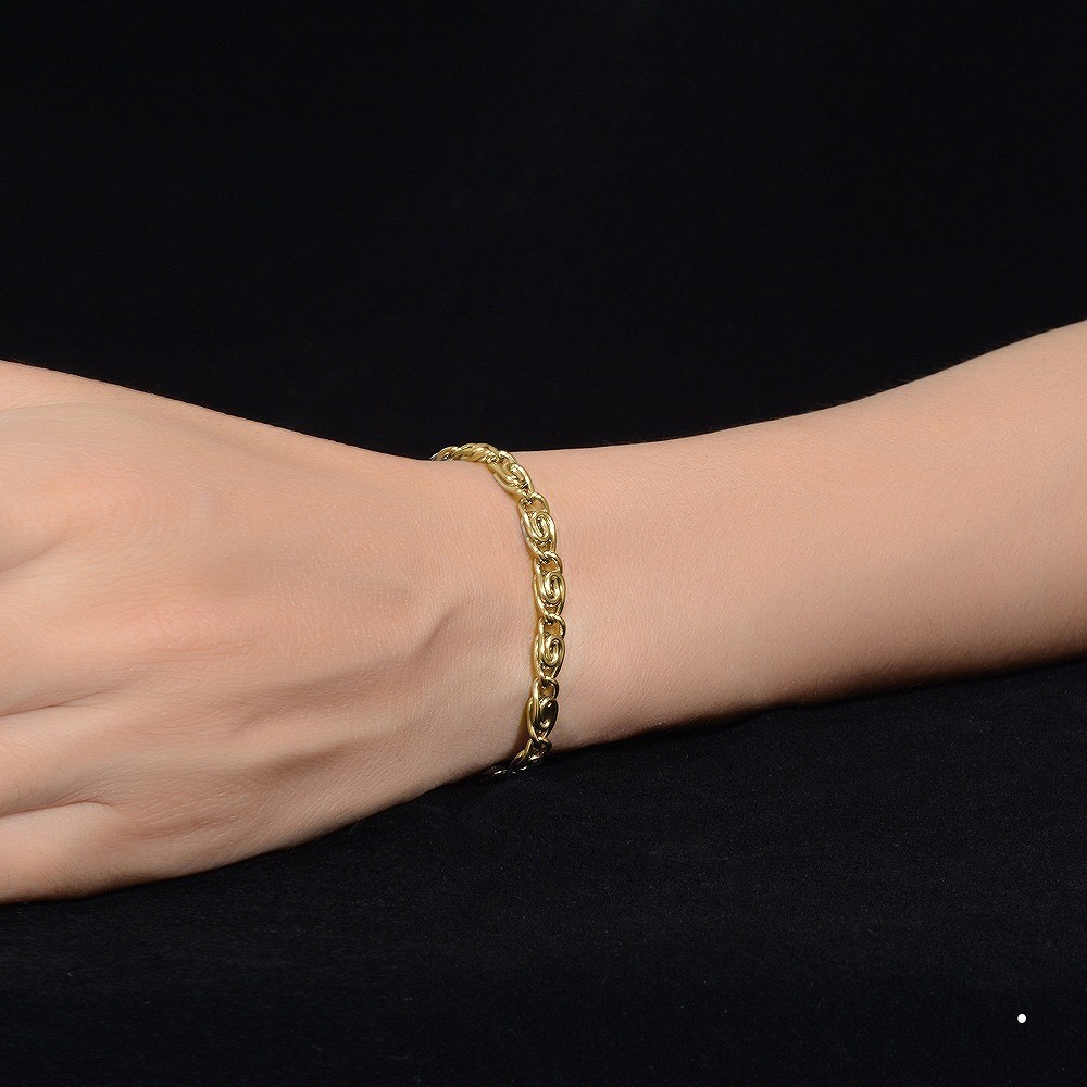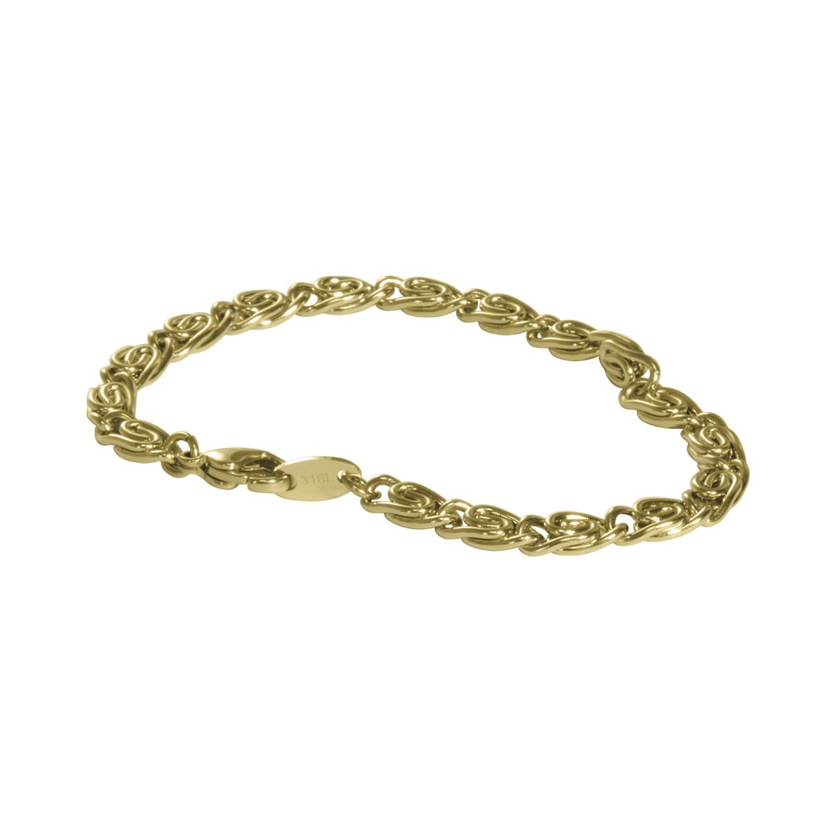 Sカーブチェーンとも呼ばれるチェーンで、波の様な渦巻き(うずまき)デザインが特徴的なブレスレットです。 ※イオンプレーティング(IPメッキ)とは、金属イオンと不活性ガスを反応させた化合物を製品に蒸着させるコーティングで、ガスの比率でカラーを調整します。従来の鍍金加工に比べて表面耐久性、密着性、工程の安全性が飛躍的に向上しております。 |