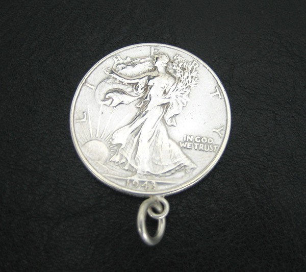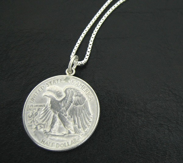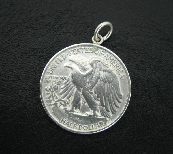 通称ウォーキング・リバティー銀貨と呼ばれる銀品位90%のアメリカの50CENT通貨(ハーフダラー)をペンダントに仕上げました。ウォーキングリバティーはアメリカ史上最も美しいコインと呼ばれています。※本物のアンティーク通貨を使用している為、風合やデザイン等が多少異なる場合がございます。 |