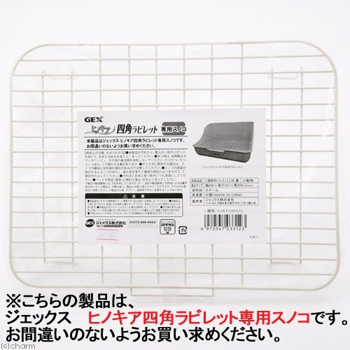四角トイレ・無し M 65259・・PatternName:単品・本体サイズ (幅X奥行X高さ) :26×20.7×4.5cm・本体重量:0.123kg・原産国:中華人民共和国商品紹介 ゆったりサイズで安定!寝床&巣箱にも最適な四角トイレ「ヒノキア 四角ラビレット」専用スノコ。 広い網目(1.4cm)でうんちが詰まらない※仔うさぎに使用する場合は、スノコの網目に足を挟む場合があるので注意してください。 製品サイズ:幅26.0×奥行20.7×高さ4.5cm 使用上の注意 ※本製品はうさぎ・小動物等のペット専用です。他の目的には使用しないでください。※本製品は火気に近づけたり、高温になる場所に置かないでください。※本製品が欠けたり、ヒビが入った場合は使用しないでください。※スノコの塗装が剥がれるとスノコが劣化し、耐久性が落ちて事故の原因となりますので、ご使用を中止してください。※汚れはこまめに取り除きいつも清潔にしてください。 原材料・成分 スチール 使用方法 「ヒノキア 四角ラビレット」の交換用スノコとしてお使いください。 ※製品の仕様、デザイン、価格等予告なく変更することがあります。
