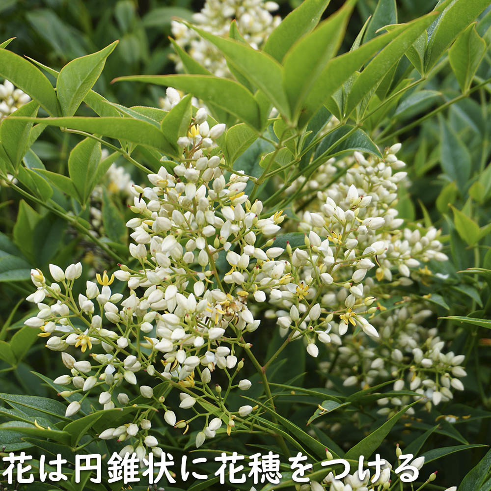 ナンテンは庭木の代表的な品種です。他の南天と比べて背が高くなります。初夏に白い花をつけて、秋には真っ赤な実をたくさんつけます。昔から縁起木としられ、風水にもよく使われます。