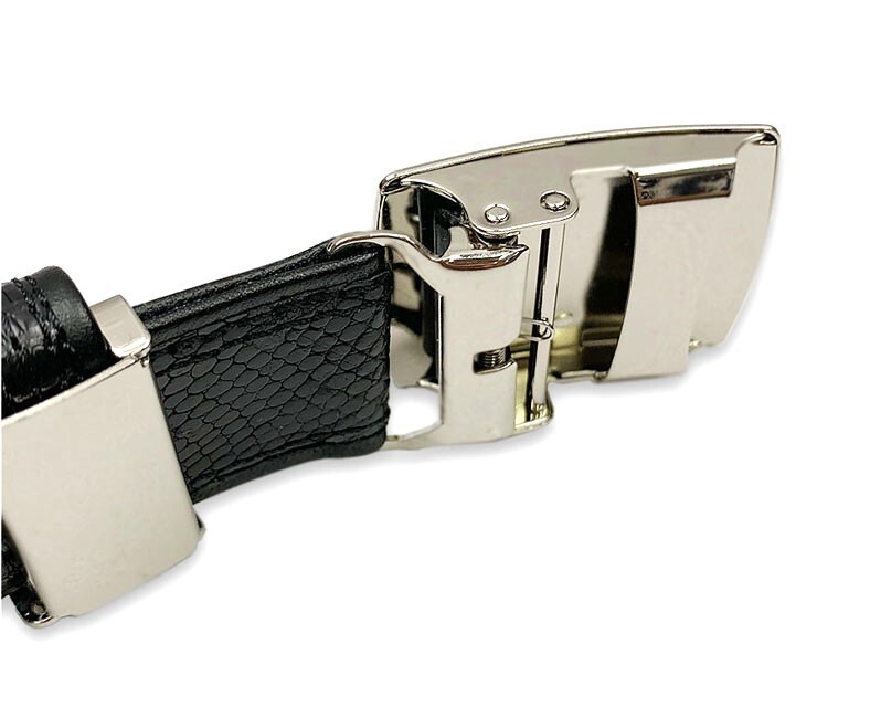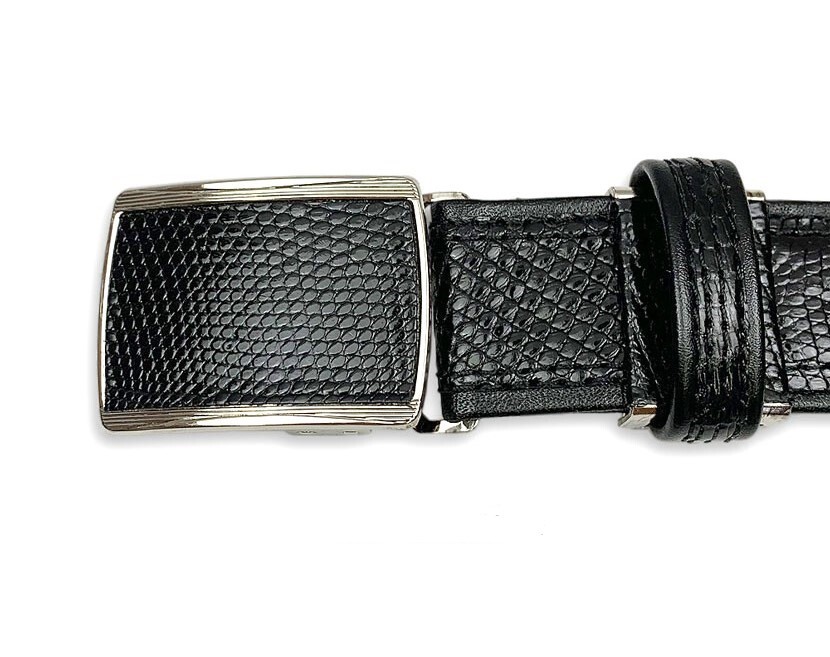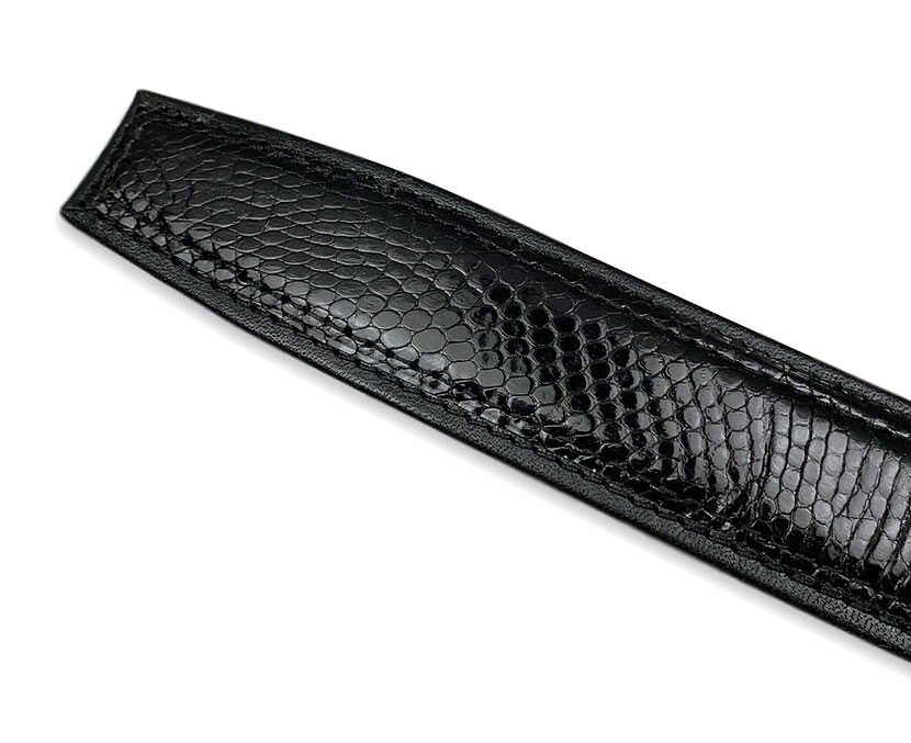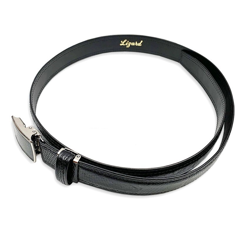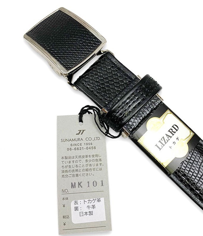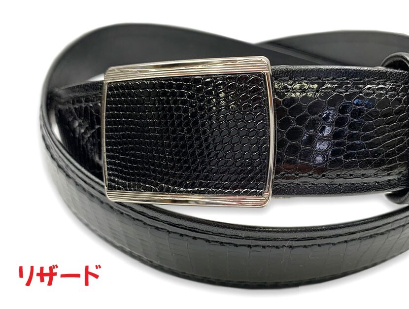 【新品】 日本製 リザード レザー トカゲ革 フィットバックル 裏牛革 ベルト ブラック 3cm幅 全長105cm 【送料無料】 | |||