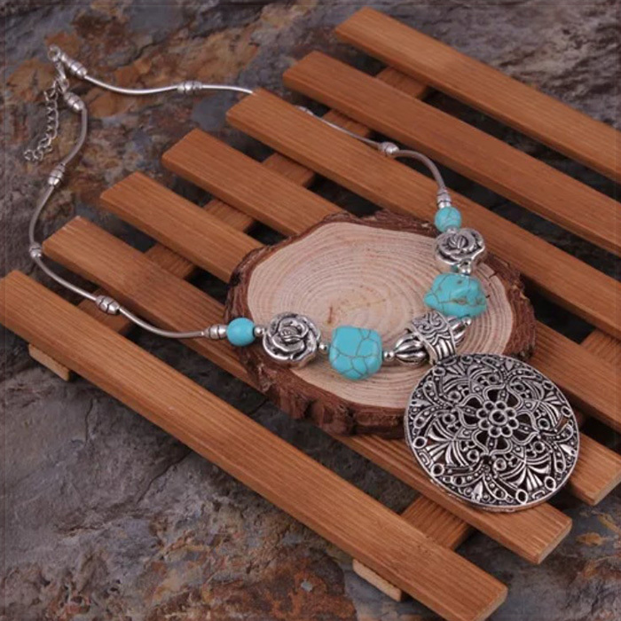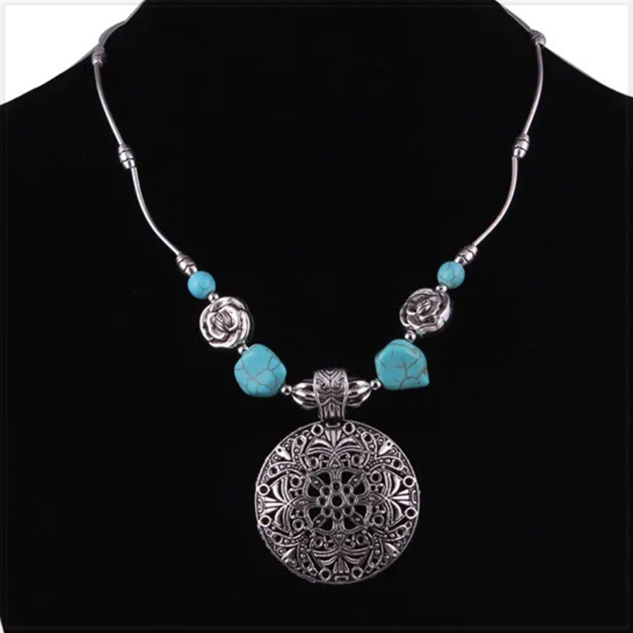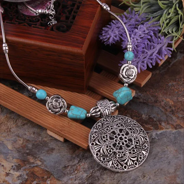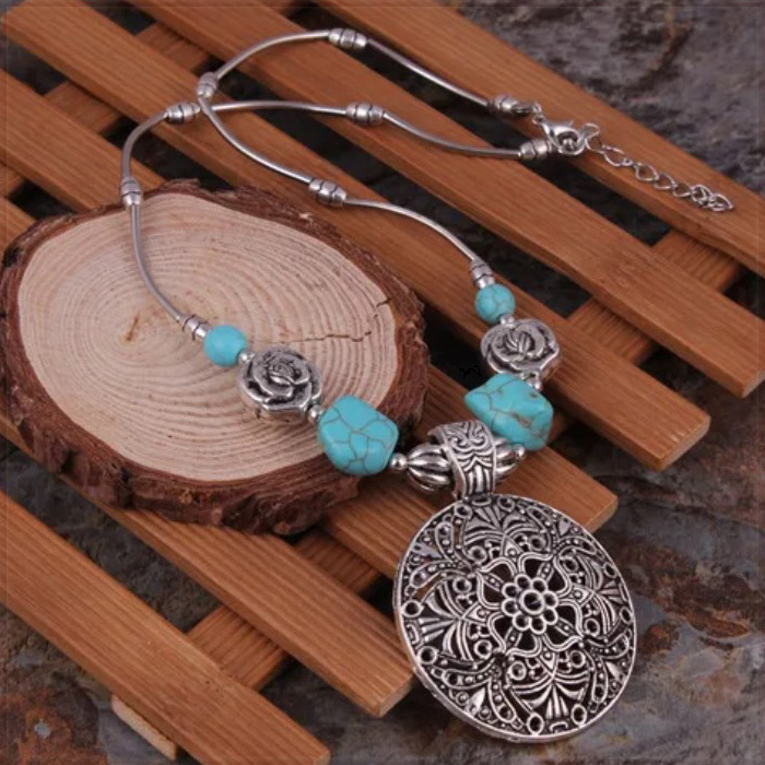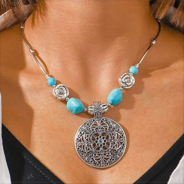 [PENDANT NECKLACE] ヴィンテージシルバー ペイズリー彫刻 デザイン φ47mm メダル ペンダント ターコイズ ストーン ボヘミアン ネックレス