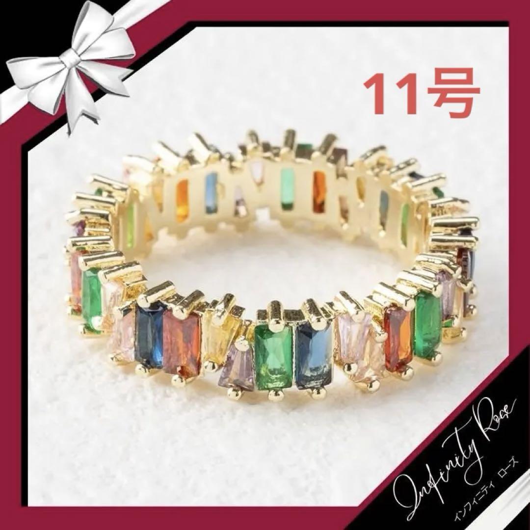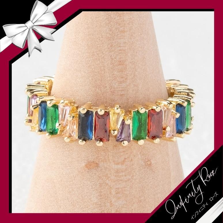 (R002GCL)11号 ゴールド×カラフルスクエアキュービックジルコニア(CZ)リング 爪留め指輪