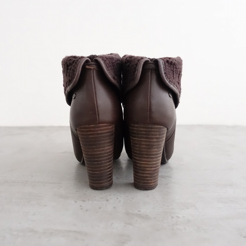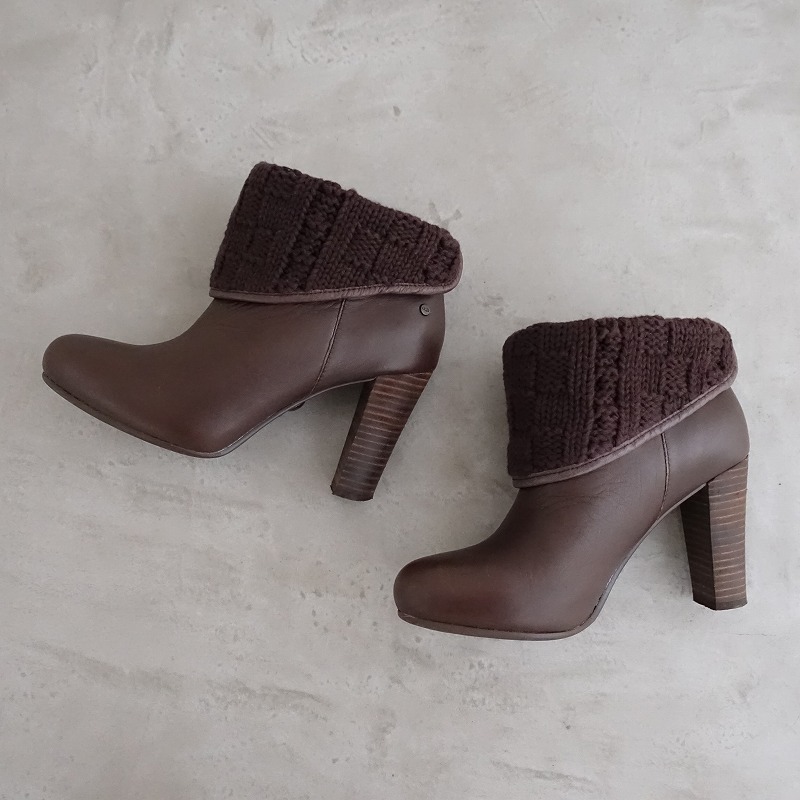 | UGGのW DANDYLION TRES レザーニットアンクルブーツです。カラーはブラウンで、レザー素材です。履き口折り返し部分はニット素材で、インソールの一部はボア素材が使用されております。 |