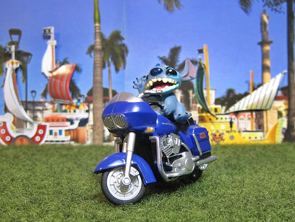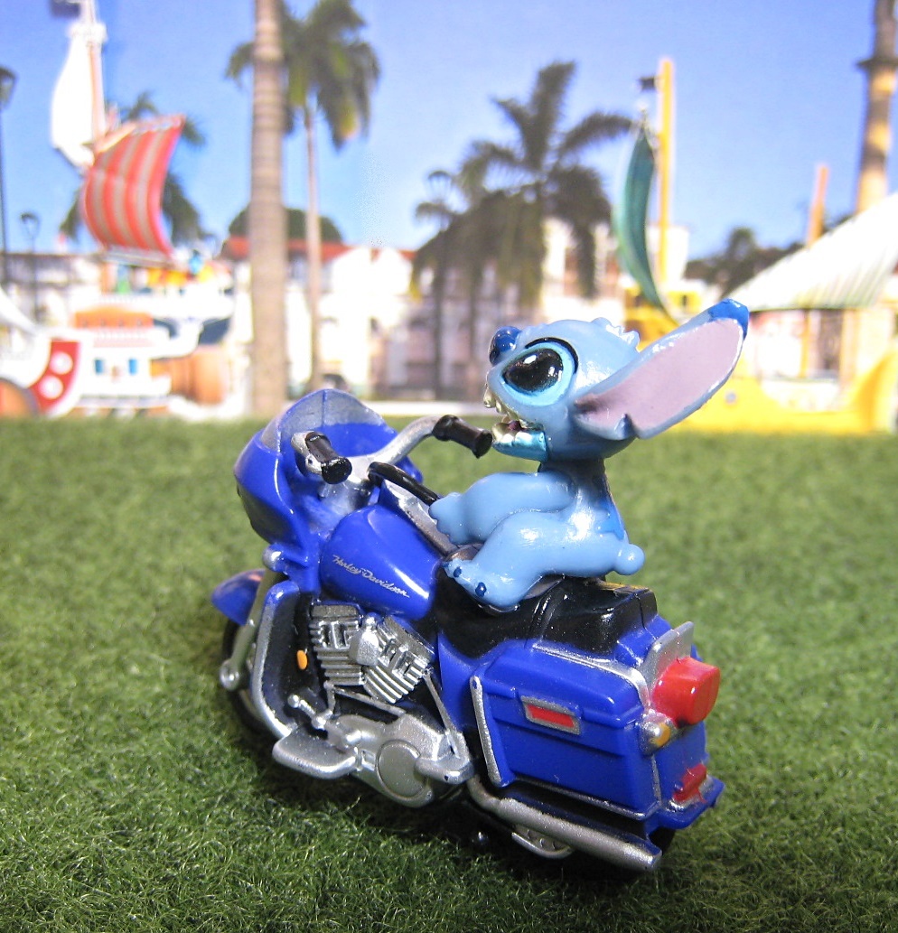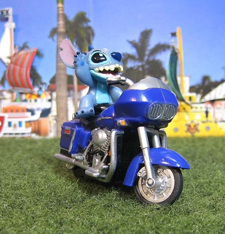 キャラクターの中でも特にやんちゃが売りのスティッチは 缶コーヒーの景品として付いていたユルめのおまけバイクとの相性が