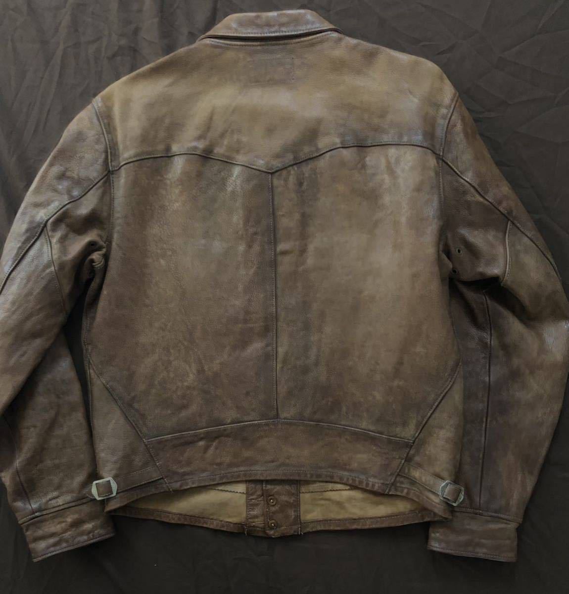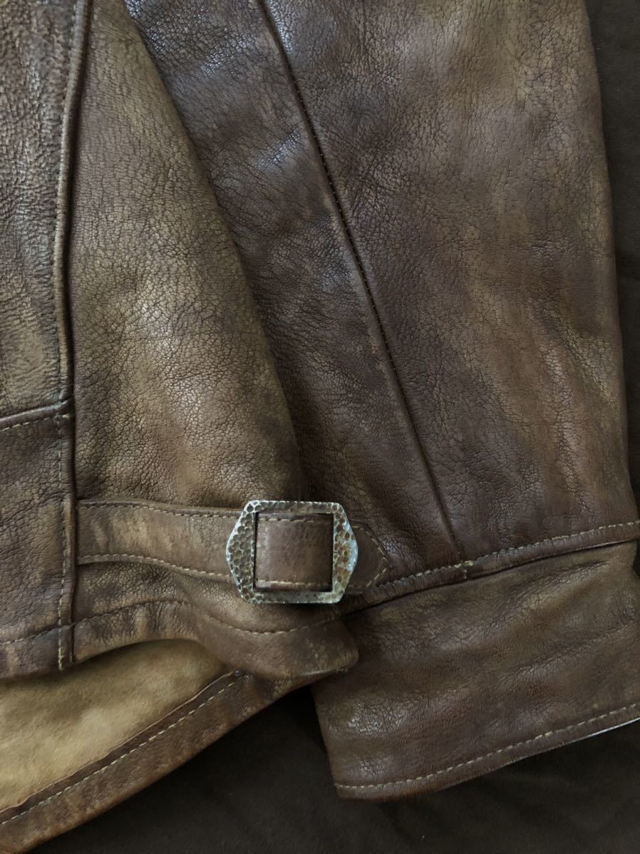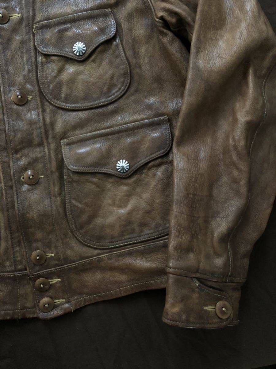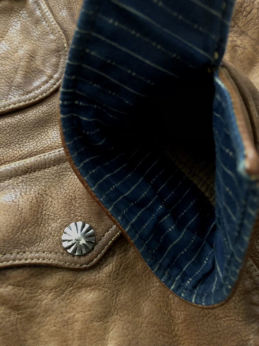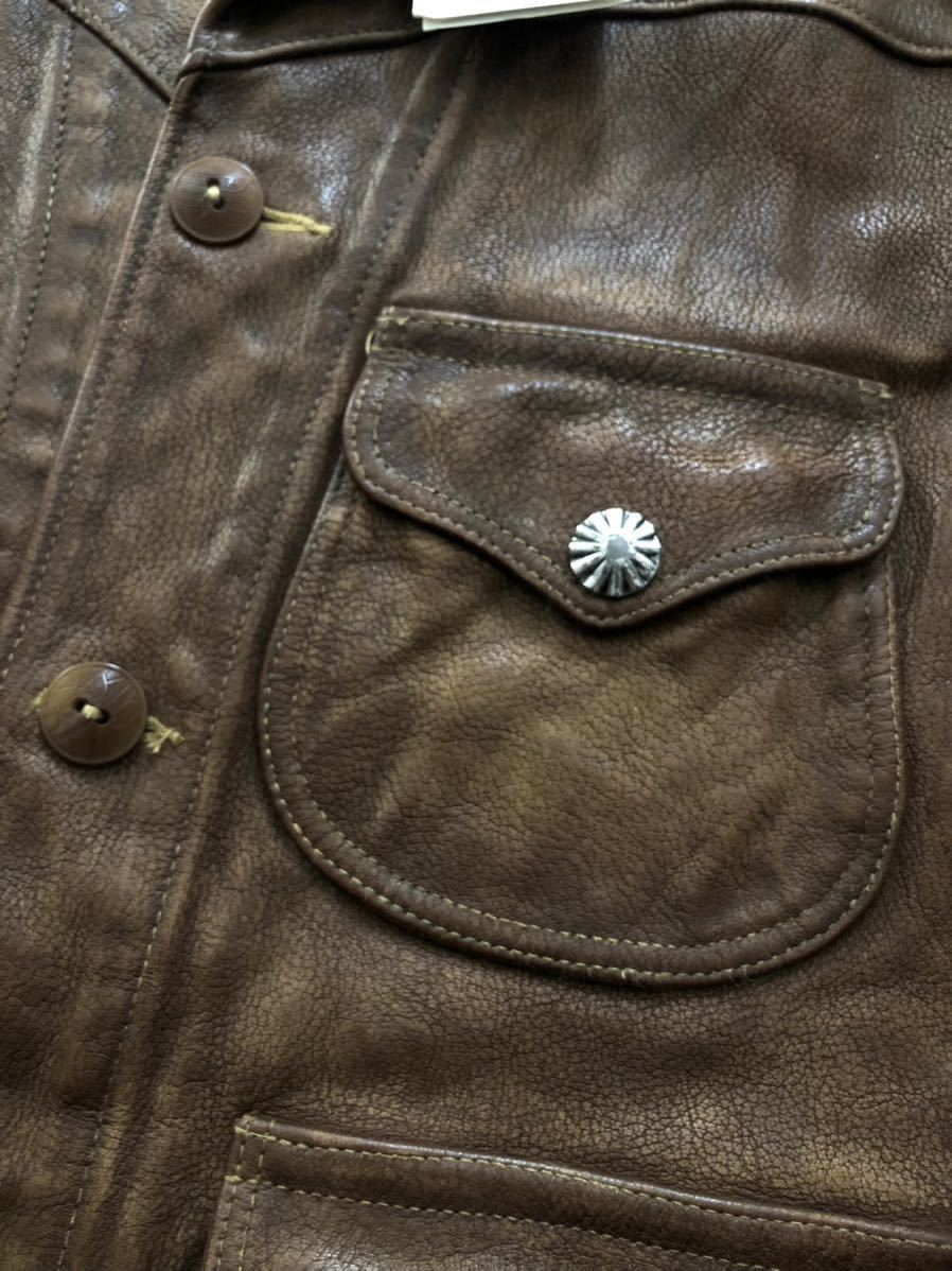 シボ感の強い雰囲気抜群の最高級ゴートスキンに、コロゾボタンを使用したボタンアップフロント、激渋なコンチョスナップボタンを配した特徴的なパッチポケット、カフスの形状、サイドアジャスターの彫の入ったバックル、ウエスタンヨークを採用した迫力のバックスタイル等、非の打ち所の無い完璧な仕上がり。