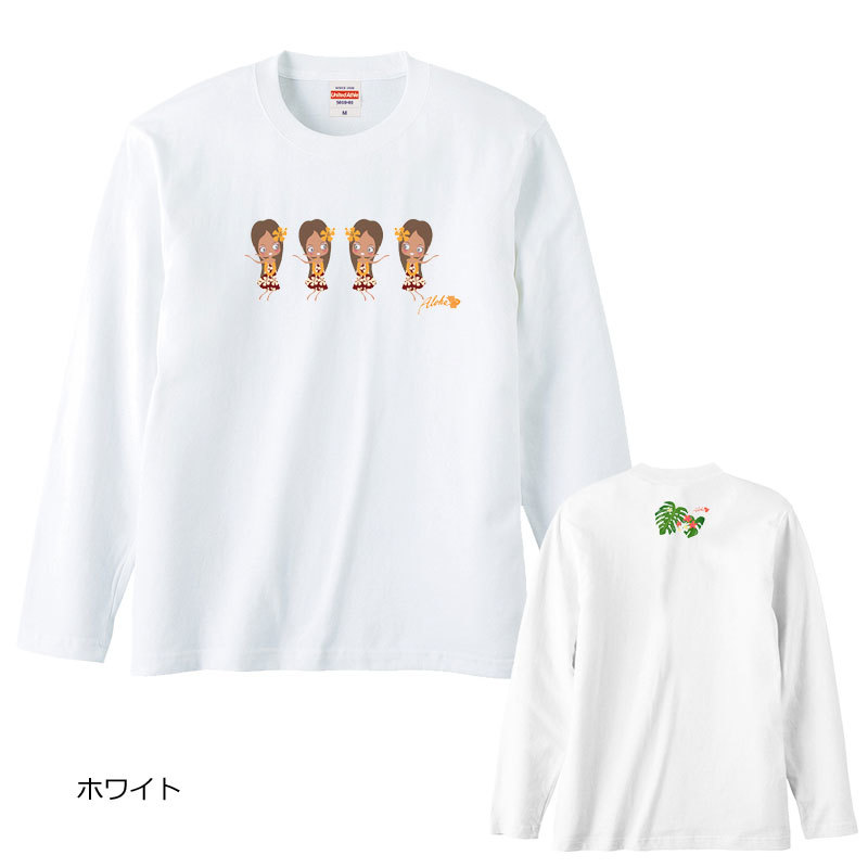 レディースL対応(タグ表記M)/ホワイト【tl018】*4人フラガール&モンステラ*男女兼用/長袖/Tシャツ/フラダンス/ハワイアン/送料無料