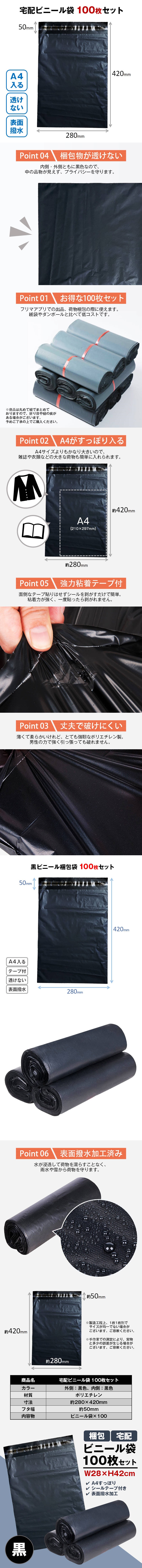 | フリマアプリでの出品に最適な、黒色の宅配ビニール袋100枚セットです。個人だけでなく企業の方にもオススメ。紙袋やダンボールと比べてかさばらず低コスト。A4サイズがすっぽり入り、衣類や雑誌が入れられる。伸縮性があり強く引っ張っても破れにくいポリエチレン使用。中身が透けず、プライバシーが守られて安心。袋の表面に撥水加工が施され、荷物が濡れない。強力粘着シールテープが付いて、梱包作業が楽々。商品仕様カラー:外側:黒色、内側:黒色,材質:ポリエチレン,寸法:約280×420mm,フタ幅:約50mm,内容物:ビニール袋×100,キーワード:メール便 ゆうゆうメルカリ便 ネコポス ゆうパケット ゆうパック 定形外郵便 クリックポスト フリマ 出品 梱包 配送 アパレル 大きい※商品仕様や外観は予告なく変更される場合がございます。※輸入品の為、ご利用に支障のない程度の傷、汚れ、折り目などがある場合がございます。※製造工程上、サイズが均一でない場合がございます。※手作業での測定により、実物と多少の誤差が生じる場合がございます。※モニター発色の具合により、実物と色合いが異なる場合がございます。上記をご了承の上でご注文ください。 |