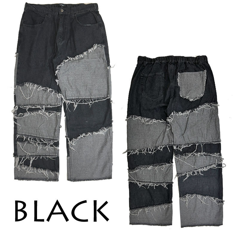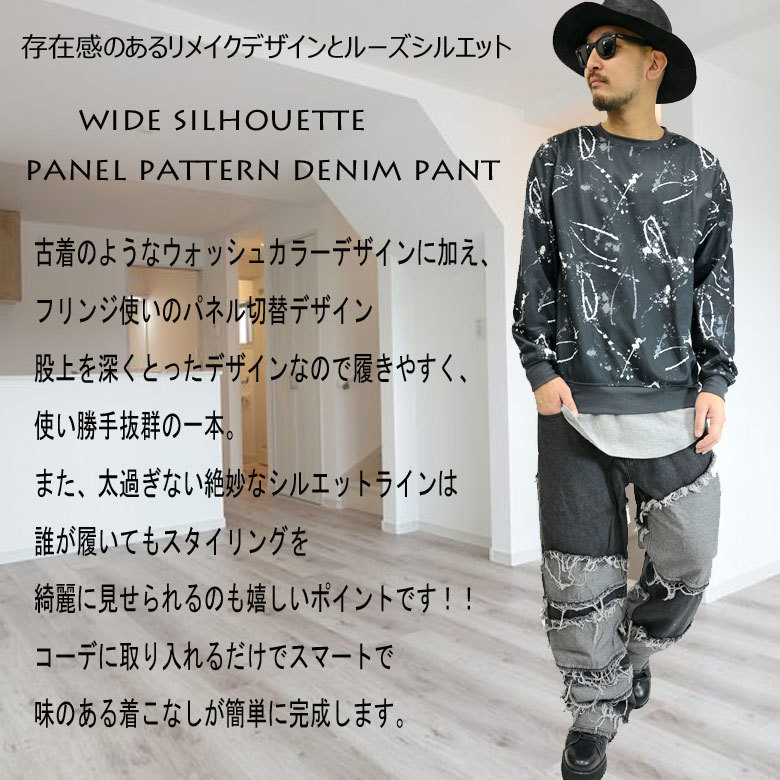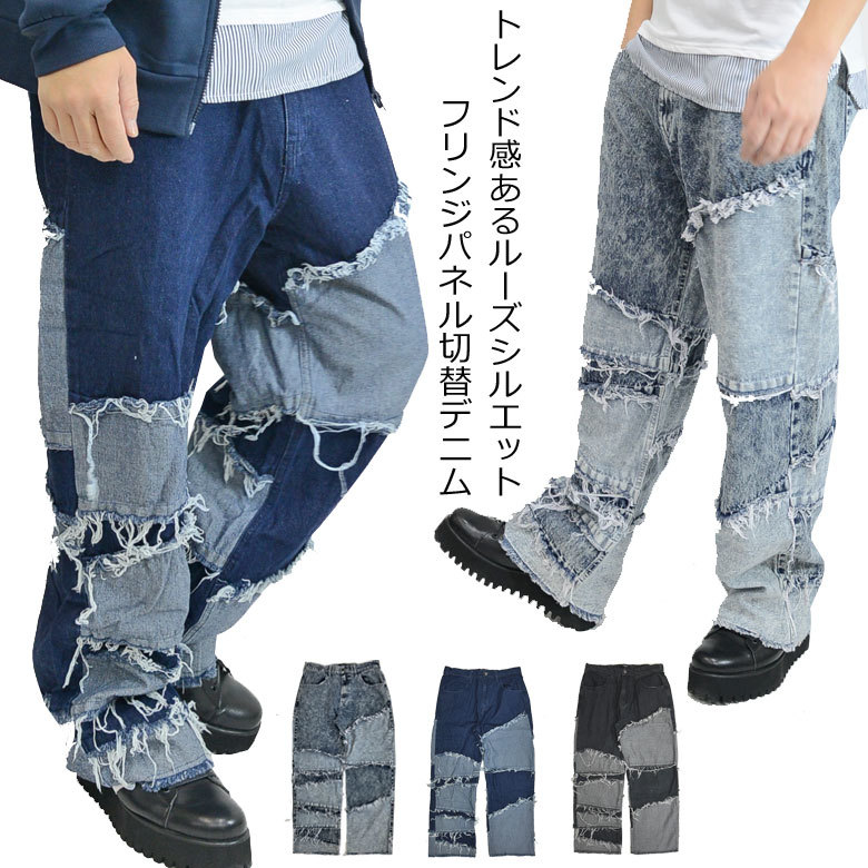 「ルーズシルエッフリンジパネル切替ワイドデニムパンツ」