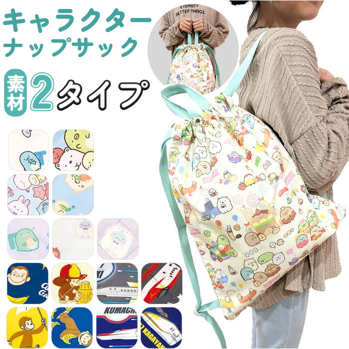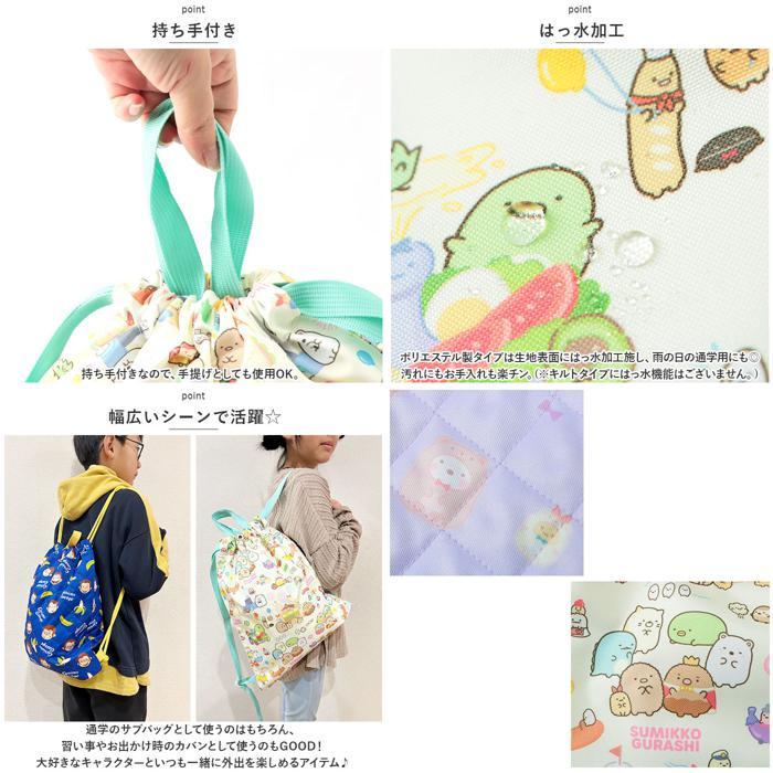 商品説明 | ・・キャラクターのプリントデザインが可愛い♪体操着入れやお道具入れにぴったりなナップサック。 ・【開閉楽チン♪】 ・サイドの巾着紐やベルトをキュッと絞るだけ!お子さまでも簡単に開閉が可能。 ・【2タイプ展開】 ・キルトタイプとポリエステル製タイプの2タイプをご用意♪どちらも可愛いキャラクターデザインと軽い背負い心地が嬉しい◎ ・【体育着入れや図工袋として】 ・A4サイズ対応で学校で必要な小物をひとまとめに!体育着はもちろん、図工など授業で使う小物を入れるのもおススメ♪ ・【調節可能】 ・キルトタイプは紐の結び目の位置、ポリエステル製タイプはベルトのアジャスターでショルダー部分の長さ調節が可能!お子さまの成長に合わせて低学年から長く使える♪ ・【持ち手付き】 ・持ち手付きなので、手提げとしても使用OK。 ・【はっ水加工】 ・ポリエステル製タイプは生地表面にはっ水加工施し、雨の日の通学用にも◎汚れにもお手入れも楽チン。(※キルトタイプにはっ水機能はございません。) ・【幅広いシーンで活躍☆】 ・通学のサブバッグとして使うのはもちろん、習い事やお出かけ時のカバンとして使うのもGOOD!大好きなキャラクターといつも一緒に外出を楽しめるアイテム♪ |