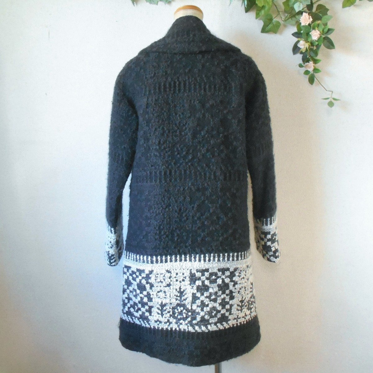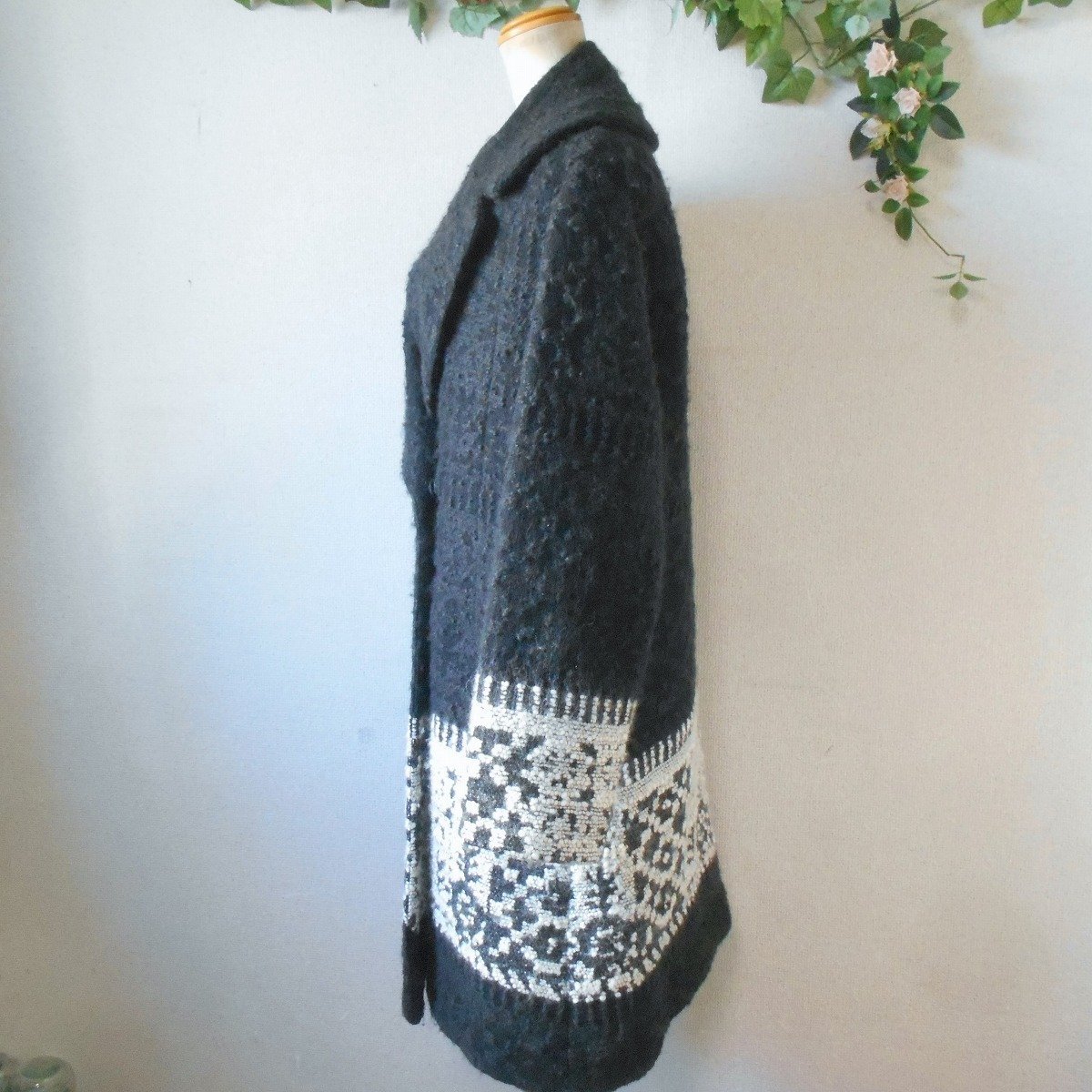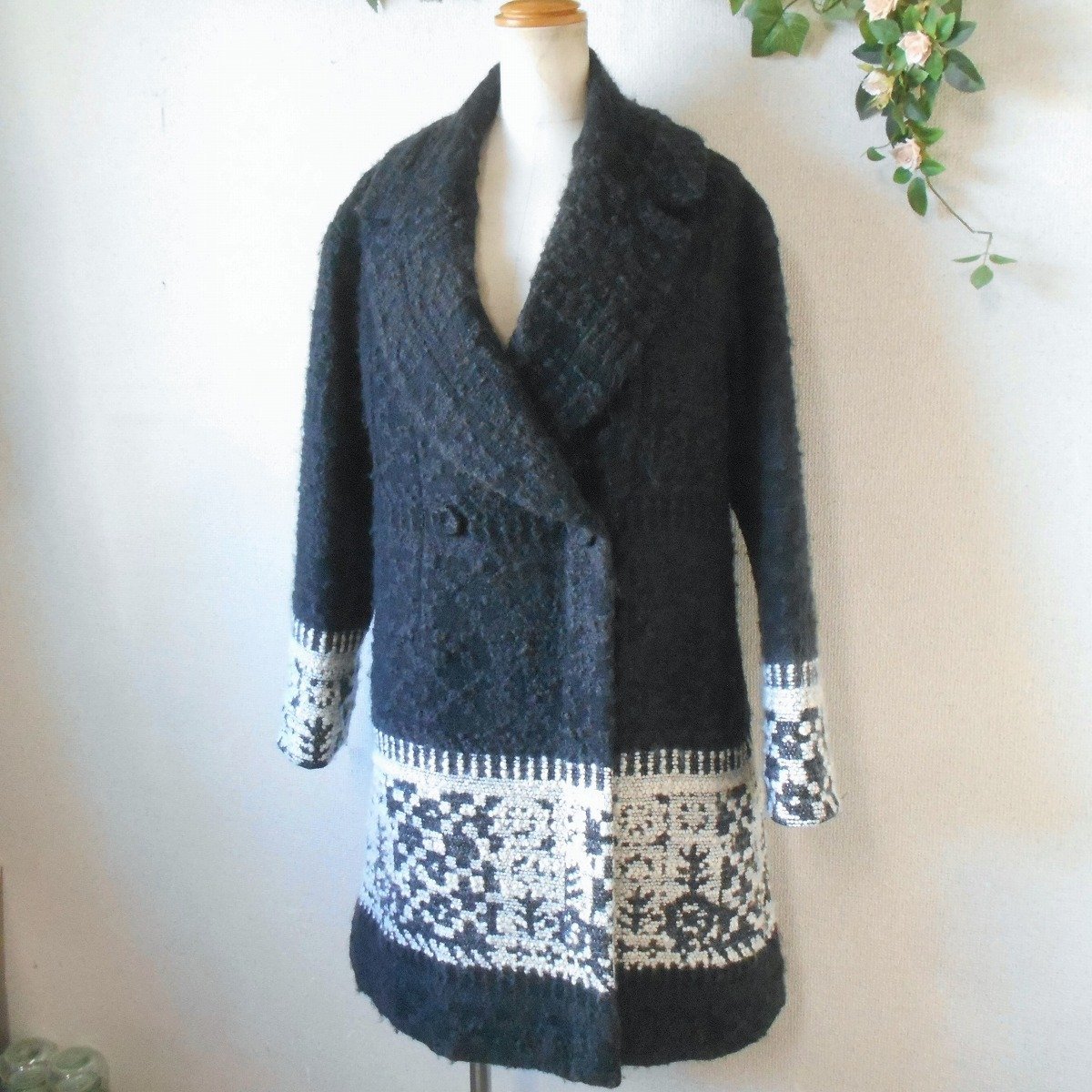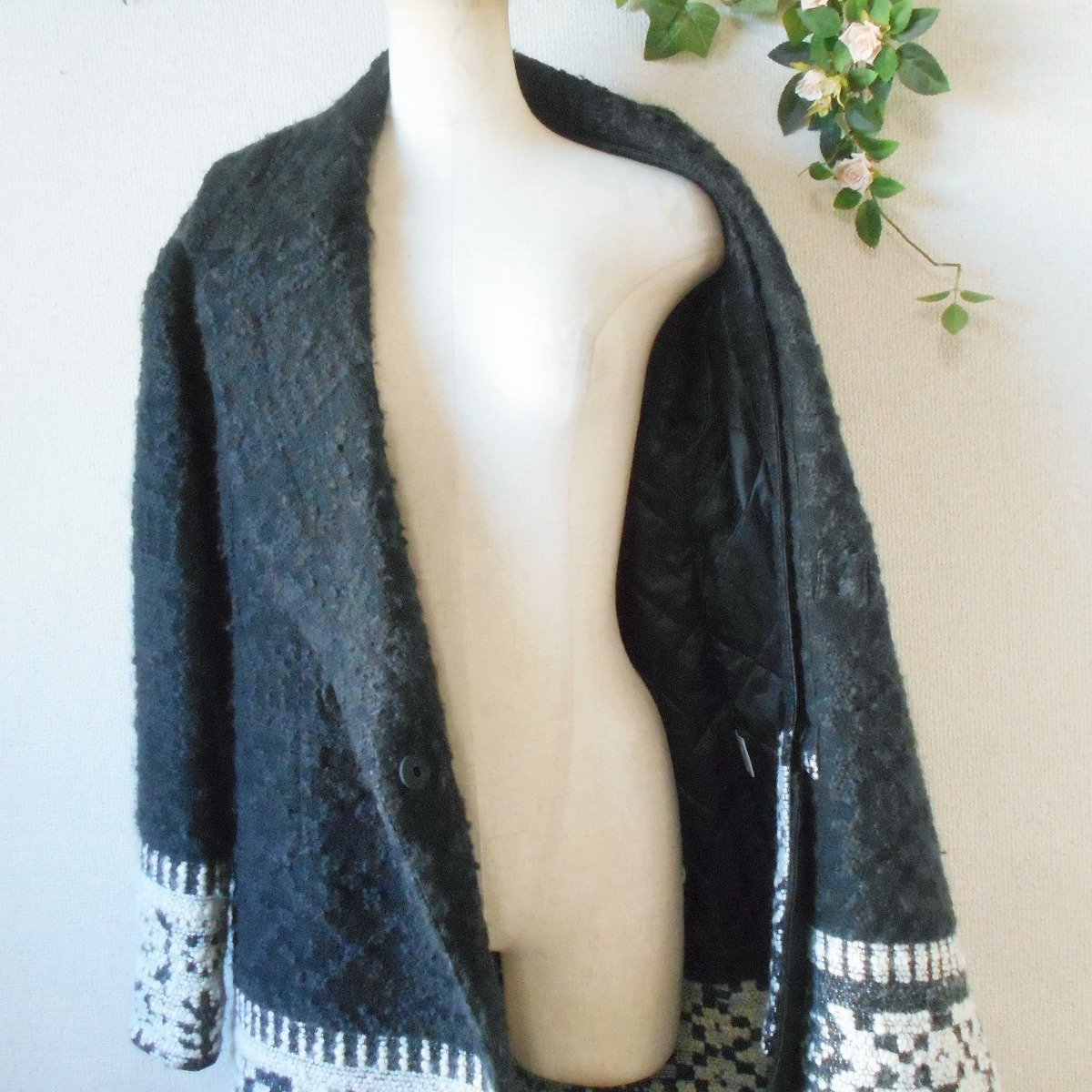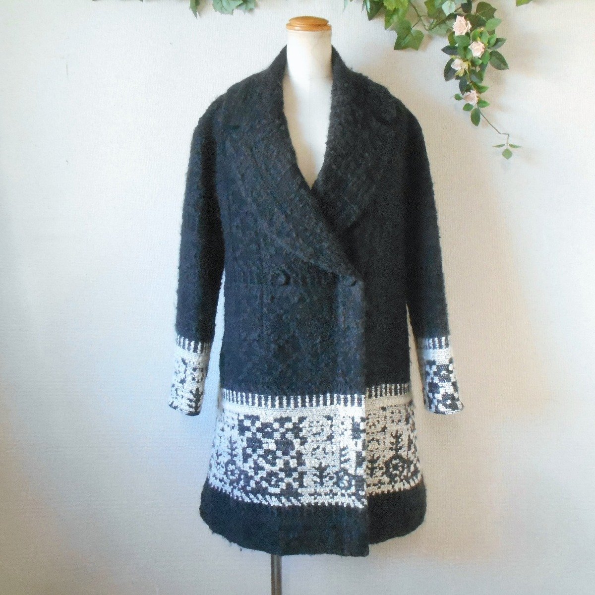 【ポイント】イッセイミヤケ、ハートのレディース用コートになります。お色は黒色ベースで柄部分はアイボリー系です。
