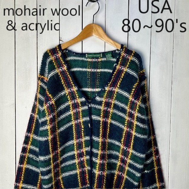 USA古着 80s~90s チェック柄 モヘアウール×アクリル ニットカーディガン M~L 緑 オールド ヴィンテージ モヘアカーディガン ●246