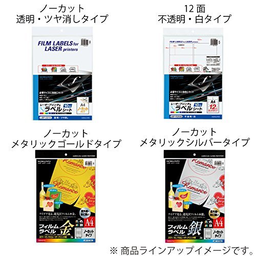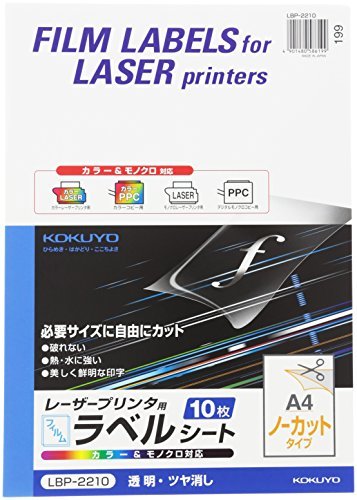 ・透明・ツヤ消し A4 LBP-2210・【用紙寸法】 297×210mm・【サイズ】 A4 【1片の大きさ】 297×210mm・【面数】 ノーカット 【枚数】 10枚・【材質】 PETフィルム 【フィルム厚】 ラベル本体/0.07mm(総厚188g/m2相当 0.15mm)より レーザープリンタ用ラベルシート(フィルムラベル)〈カラー&モノクロ対応〉 カラーレーザー・モノクロレーザー兼用の耐熱・耐水仕上げの丈夫なラベル。カラーコピー用としても使用できる。 商品紹介 ●透明・つや消し仕様のフィルムラベルです。 ●カラーレーザープリンタ・カラーコピー機はもちろんモノクロレーザープリンタ・モノクロコピー機にも使用できます。 ●紫外線、水にも強いので屋外での使用にも適しています。 ●用紙種類が選択できる機種で「タックフィルム」または「厚紙」に設定し、印刷してください。 ●ラベル片のカット部の付近では印刷がみだれる場合があります。 ●用紙厚さ188g/m2以上に対応する機種でお使いください。 ●キヤノンLBPカラーシリーズ・iR-Cシリーズ、シャープAR-Cシリーズ、富士ゼロックスDocuColor 1250・DocuPrint C1616・C2426・C3530、リコーIPSiO CX7500・CX9000、エプソンLP-9800Cおよび沖データMicrolineシリーズではご使用になれません。 原材料・成分 PETフィルム