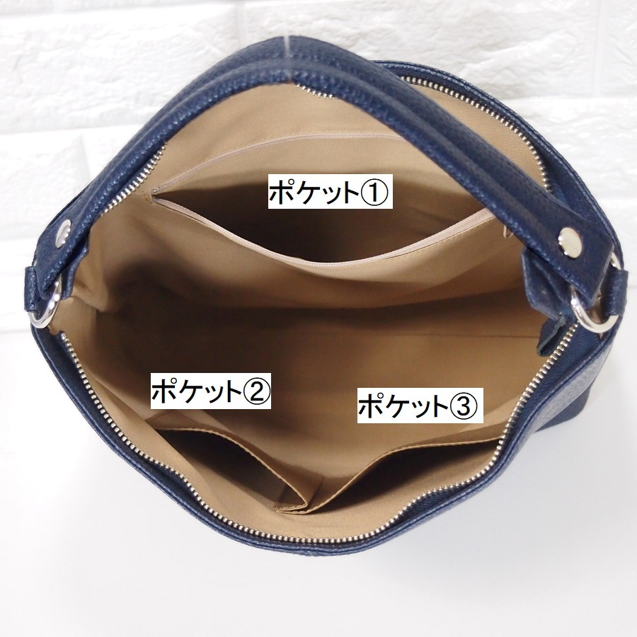 ●裏生地もしっかり付けました。裏生地を付けることによって、微細な革くずが荷物につくのを防いだり、また内部にファスナー式ポケット1つとオープンポケットを2つつけることができました。