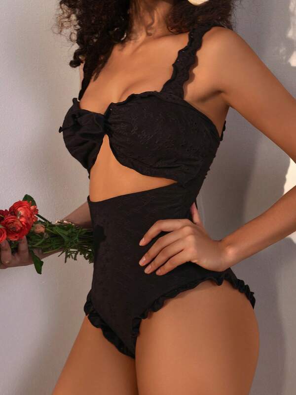 レディース 水着 ワンピース カットアウト フリルトリム ノットフロント ワンピース水着