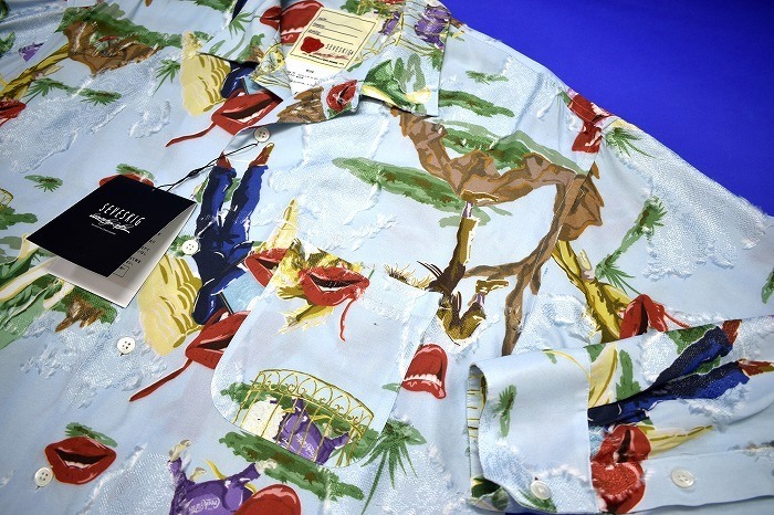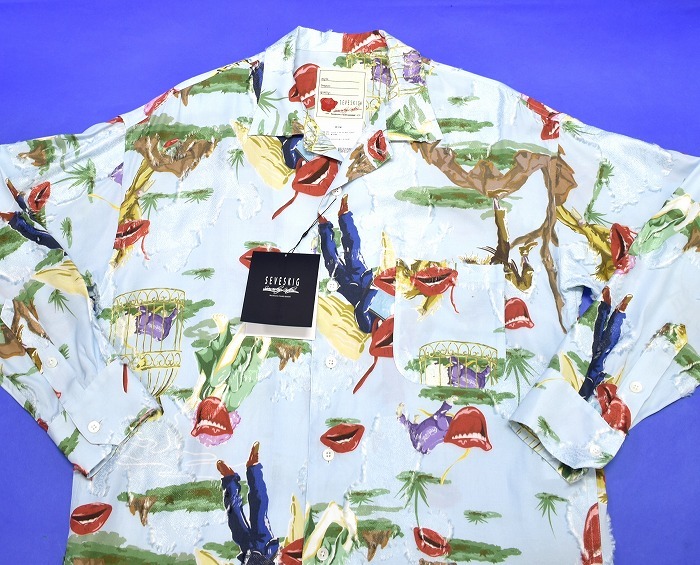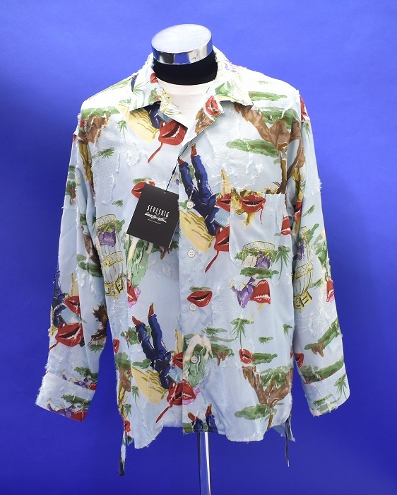 「 SEVESKIG (セヴシグ)」の Future Distortion L/SL Shirt フューチャー ディストーション 長袖シャツ 総柄 SH-SV-NSS-1004 BLUE MEDIUM M RAYON レーヨン MADE IN JAPAN アロハ ハワイアン ボーリング work ワーク おしゃれ です。