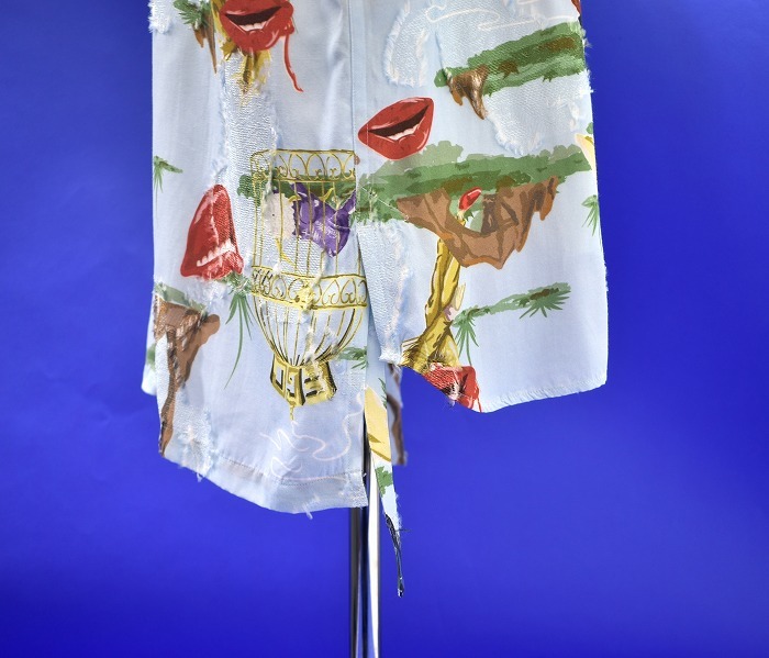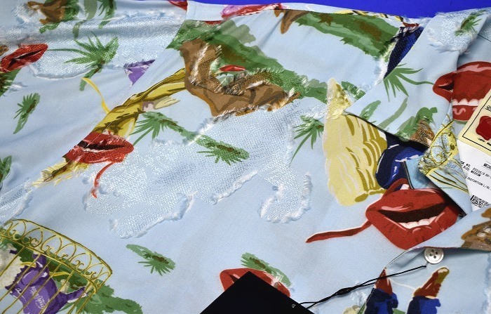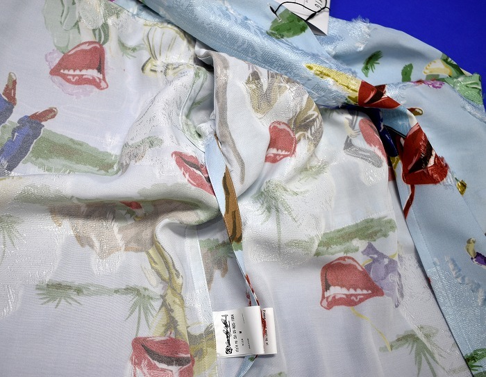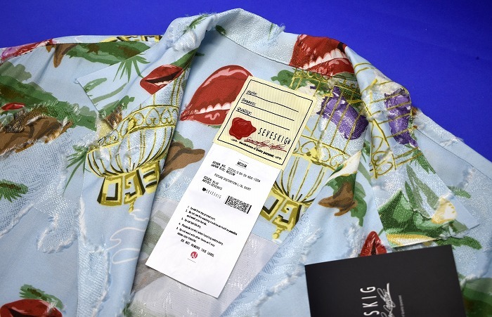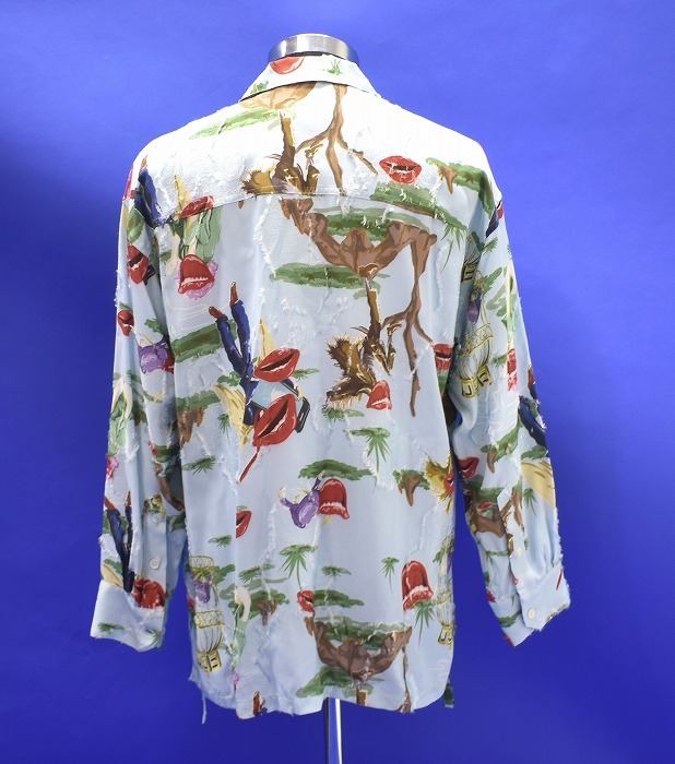 ・素材:レーヨン100% ・カラー:ブルー ・サイズ:M 実寸 肩幅 約56.5cm・身幅 約58.5cm・着丈後ろ(えり下から) 約77cm・袖丈 約56.5cm (多少の誤差はお許しください) どこか懐かしさもある90年代のヴィンテージパジャマシャツをデザインソースにしたオープンカラーのシャツ。 日本有数のジャガード産地 群馬県桐生市で製作したオリジナルファブリックを使用。 オリジナルのジャガードの上からインクジェットプリントでデザイン。 SNSの闇をイメージしたグラフィックが特徴的。 内側の脇付近にストラップがついており、肩からかける際に袖を縛らずにシャツを背負える便利な仕様になっています。 さらりとした質感高いレーヨン糸を使用し、虎のジャガードが浮き出たようにみえるのもポイント!です。 新品 ※よくみるとフロント胸ポケット部分に小さな傷がみられます。 あまり目立ちませんがご理解いただける方のみでお願いいたします。 定価¥45000(税込) 日本製 かなりお値打ちだと思います。この機会にぜひ!。 他にもいろいろ出品しています。 管理番号:292311MY-089630 N8 ★ PD112407-1000 |