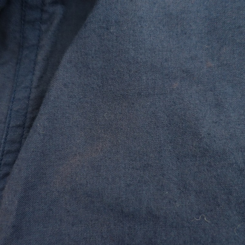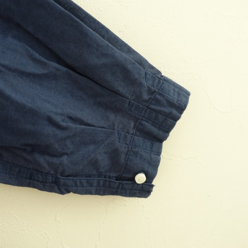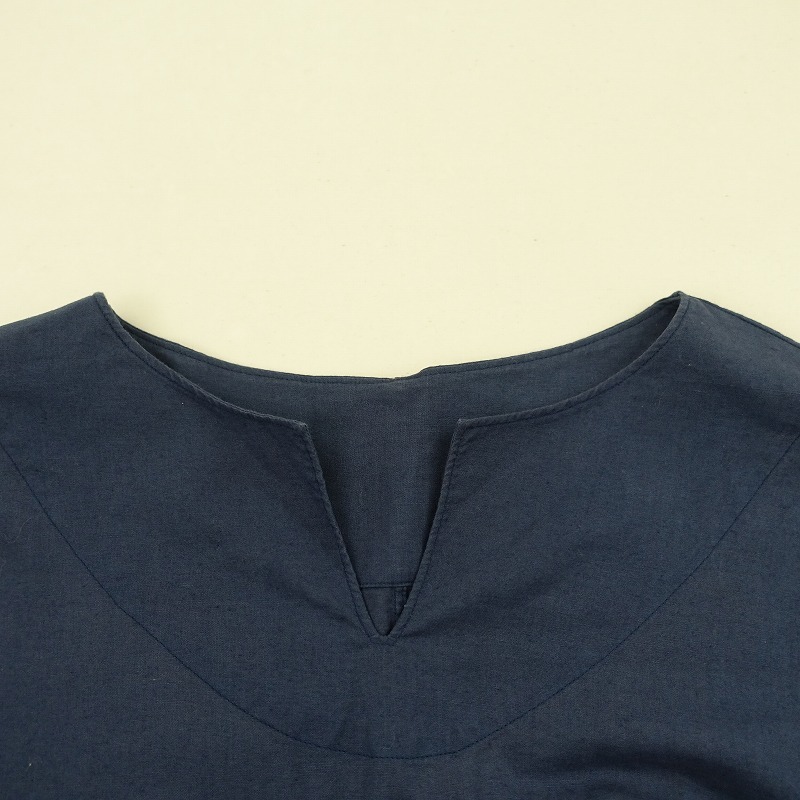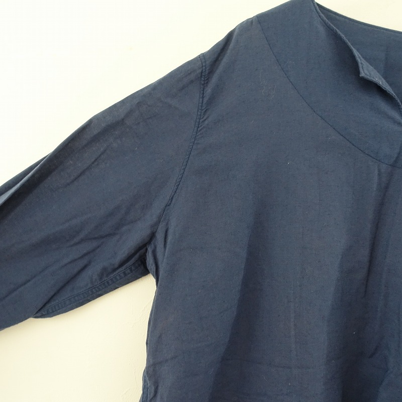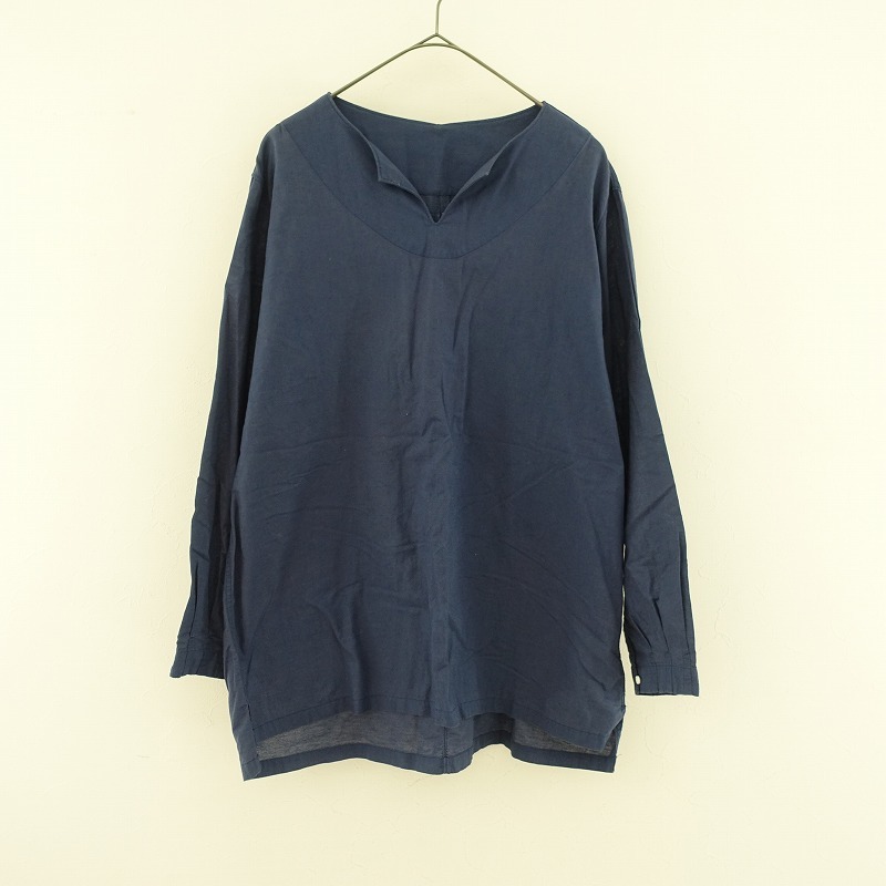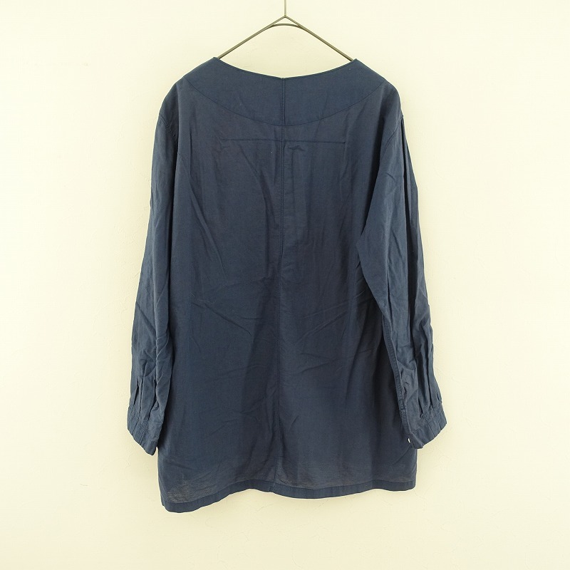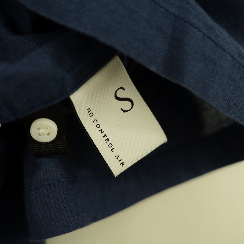 | NO CONTROL AIRのコットンリネンスキッパーチュニックです。カラーはネイビーで薄手地で仕立てられております。ノーカラーのスキッパーデザインで、袖口にタック入り、着丈はフロント側が少し短くなったデザインです。 |
