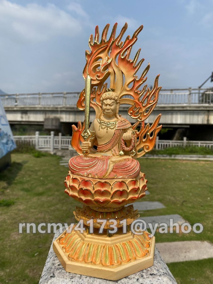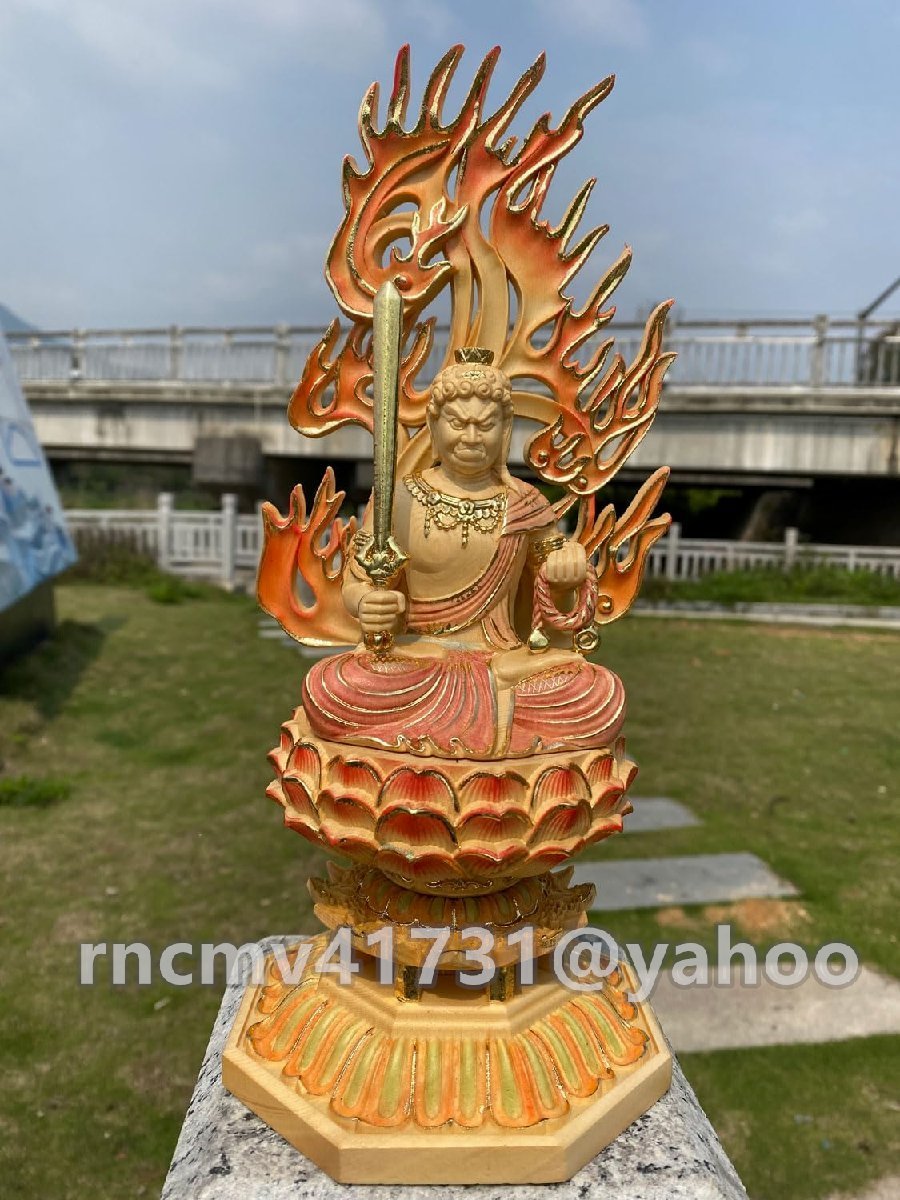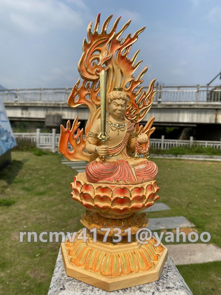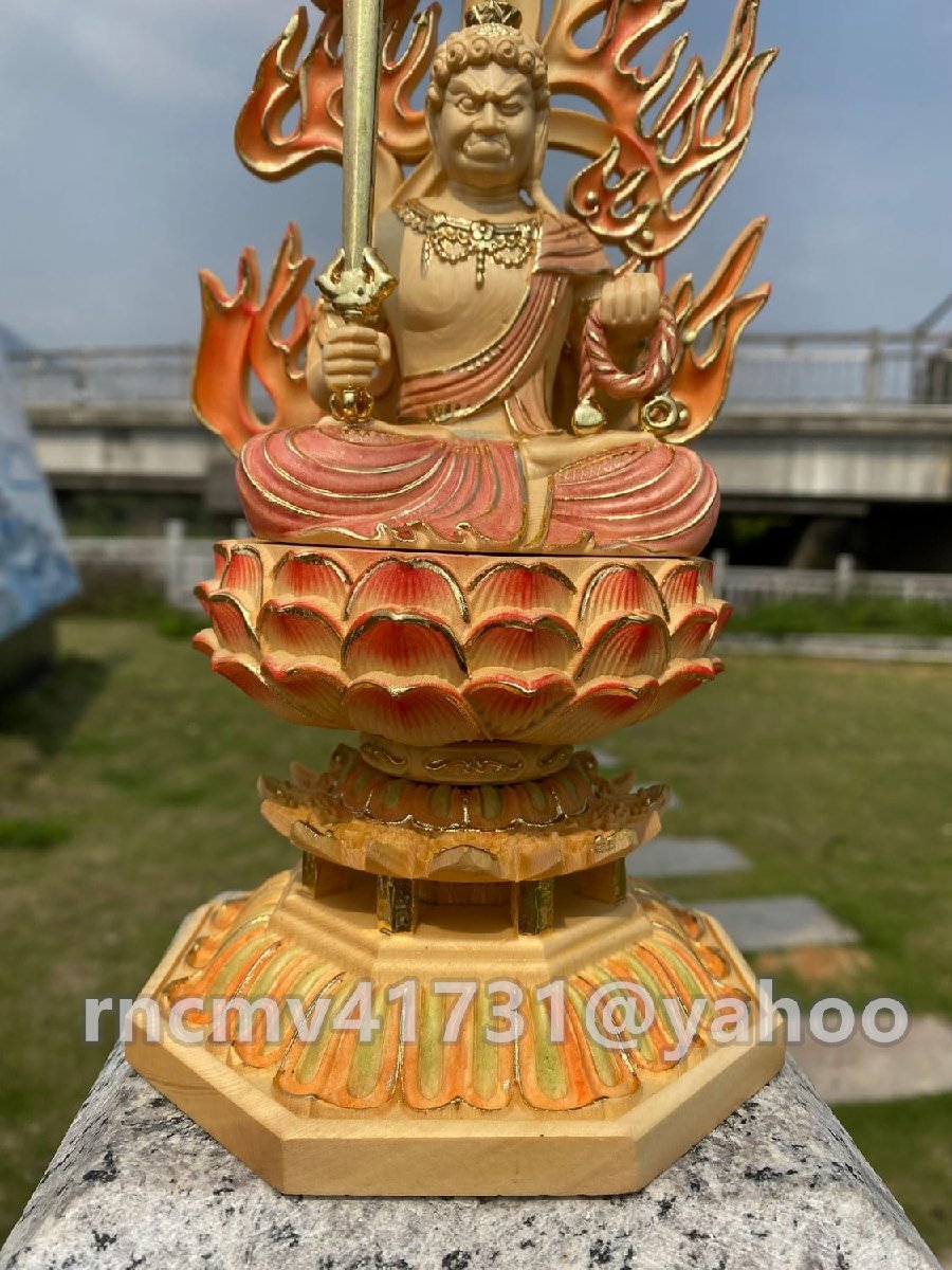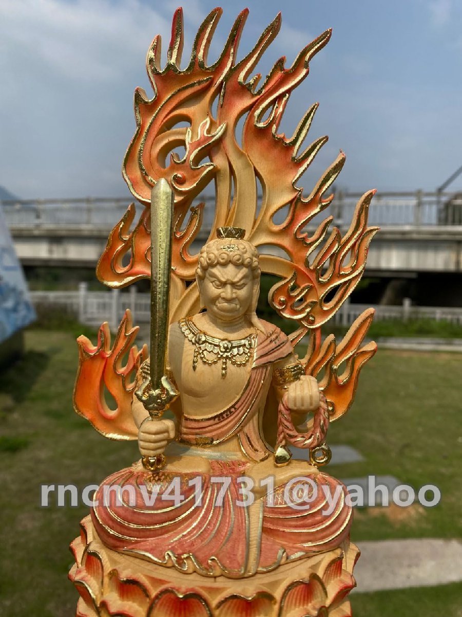 木彫りの仏像 不動明王座像-28cm (木製:桧木 金泥仕上) お守り本尊 干支 酉年(とり) 真言宗脇仏 火炎光背(ふどうみょうおう)