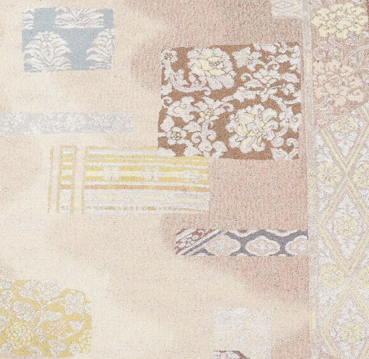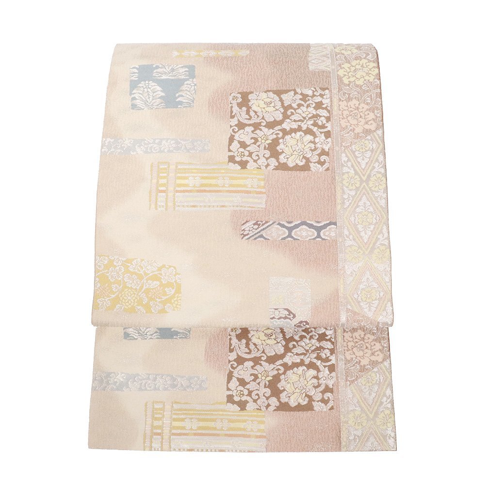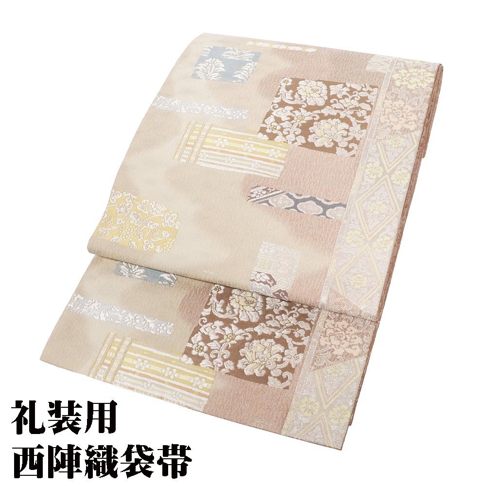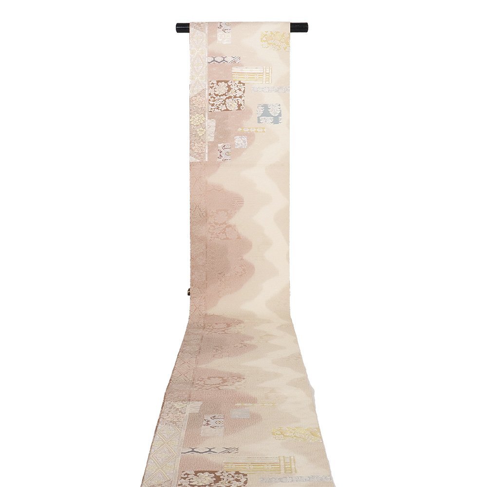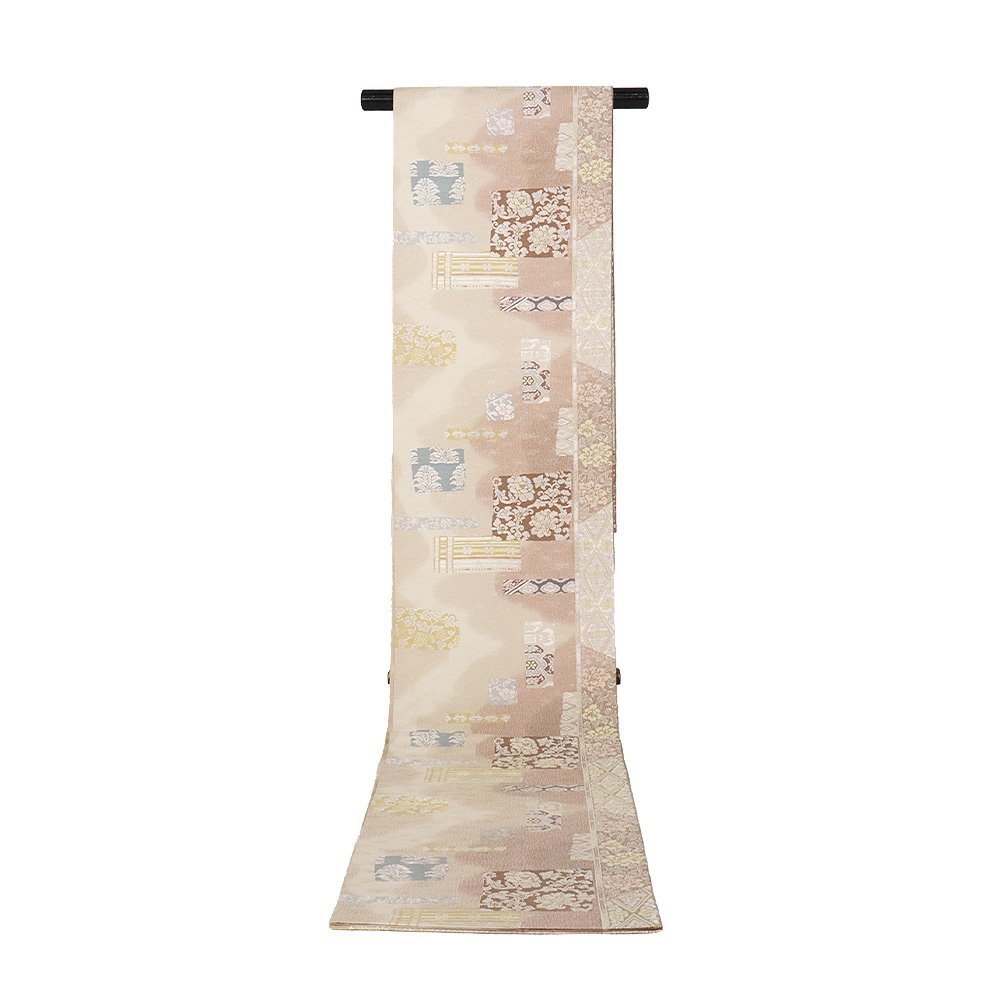 | 西陣織袋帯 袖縞取古渡裂ちらし文 赤紫・ベージュ暈し地 唐花・色紙・菱文・縦縞 仕立て上がり | |