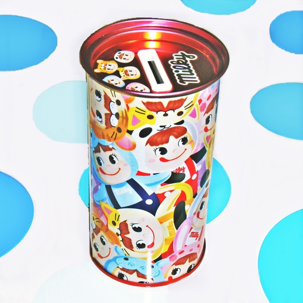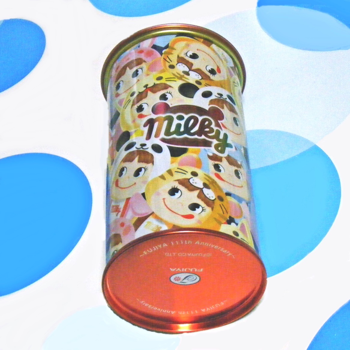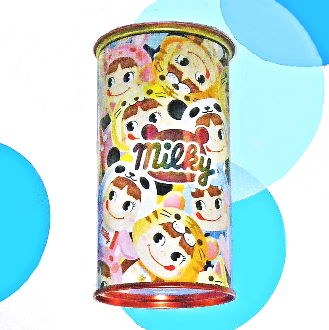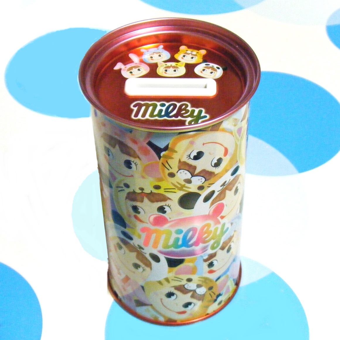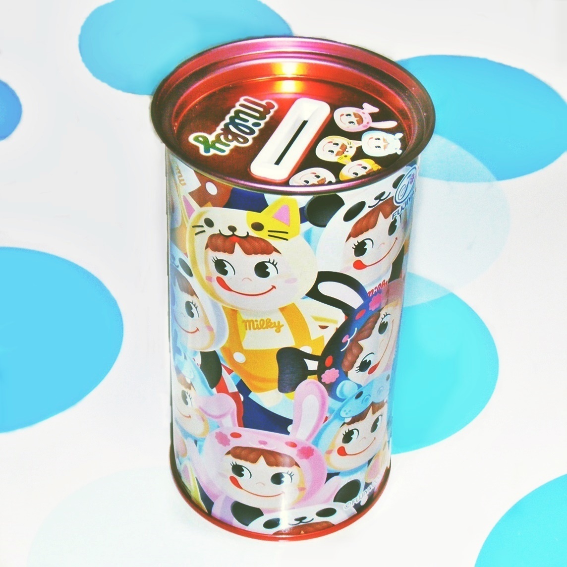 未使用品★不二家 ペコちゃんの貯金箱 筒缶 ミルキーロゴ ペコちゃん 総柄