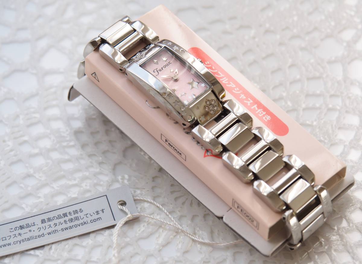 ◇未使用 送料込み 1000円~フェルゥ Feroux時計 シルバー色ベルト スワロフスキークリスタル使用 ピンクフェイスにお星さま