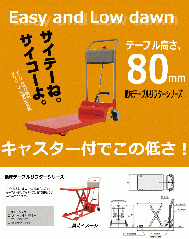 台車の荷台テーブルが最低位が80mmと通常のテーブルリフト台車に比べ、かなり低床です。