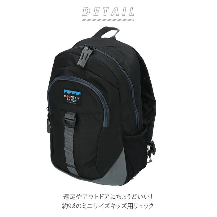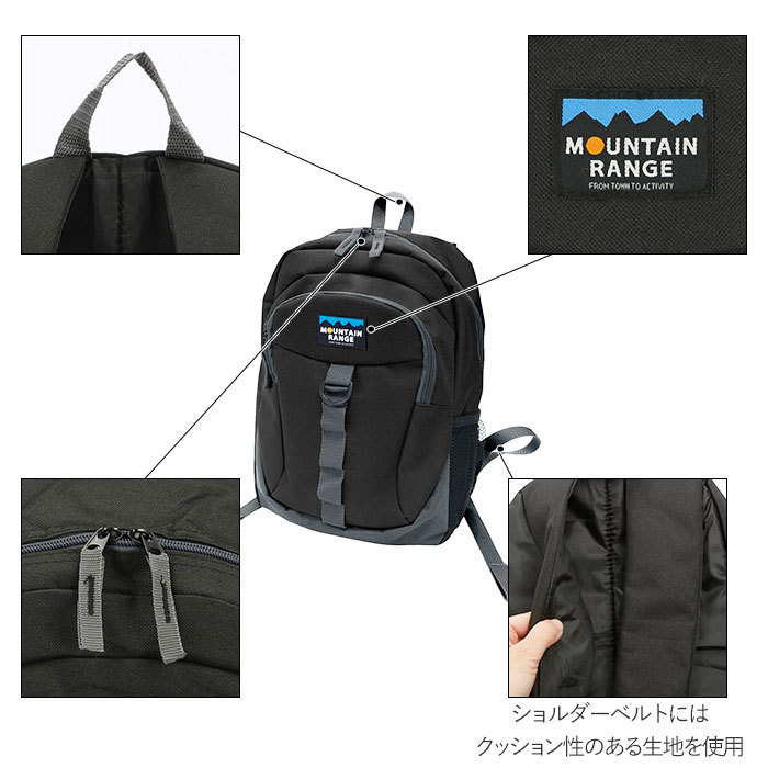 商品説明 | ・遠足やアウトドアにちょうどいい!ミニサイズのキッズ用リュック。女性用のミニリュックにも使いやすいサイズ感。 ・フロントポケットにシンプルな「MOUNTAIN RANGE」のロゴパッチを配置。カラビナを取り付けられるテープ生地付きで、ミニサイズながら、本格的なアウトドアリュックの外観。 ・フロントのファスナーポケットは、たまご型でマチに余裕のある造り。長財布やスマートフォン・パスケースなど、すぐに取り出したいものを入れておくのに便利! ・メイン収納開口部はダブルファスナー式で大きく開き、物の出し入れがラクラク!お弁当や水筒、着替えなど、小ぶりな見た目以上に収納力抜群! ・内側にはガイドブックや手帳を入れておくにちょうどいいオープンポケット付き。 ・右サイドのメッシュポケットは、ペットボトルや小さめの折りたたみ傘の収納に便利。メッシュ素材なので汗拭きタオルを入れておけばアウトドアで活躍! ・リュック背面、ショルダーベルトにはクッション性のある生地を使用。さらに幅が広めのショルダーベルトで、お子さまの肩に負担がかかりにくく、長時間背負う時にも疲れにくい♪ |